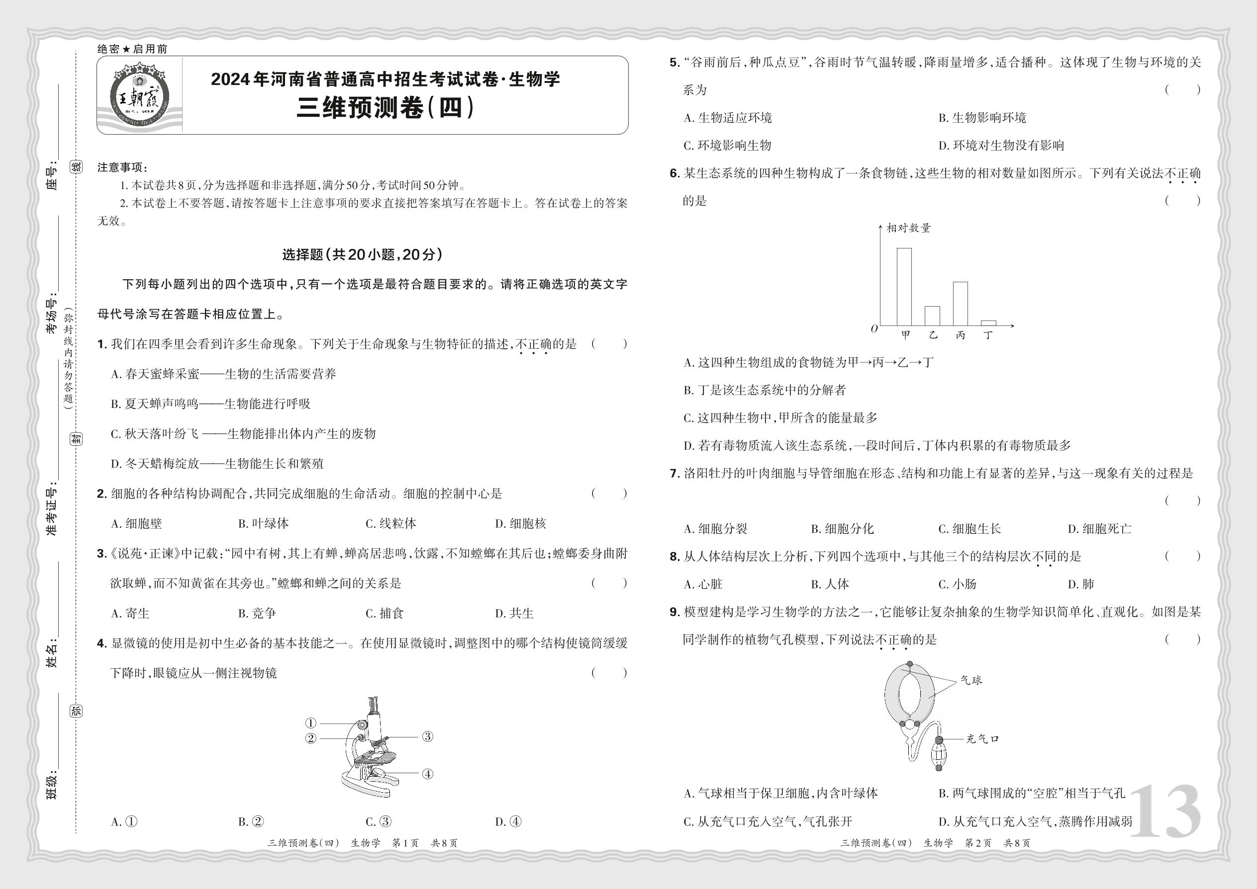 2024年河南省普通高中招生考试试卷·生物学 三维预测卷(四)