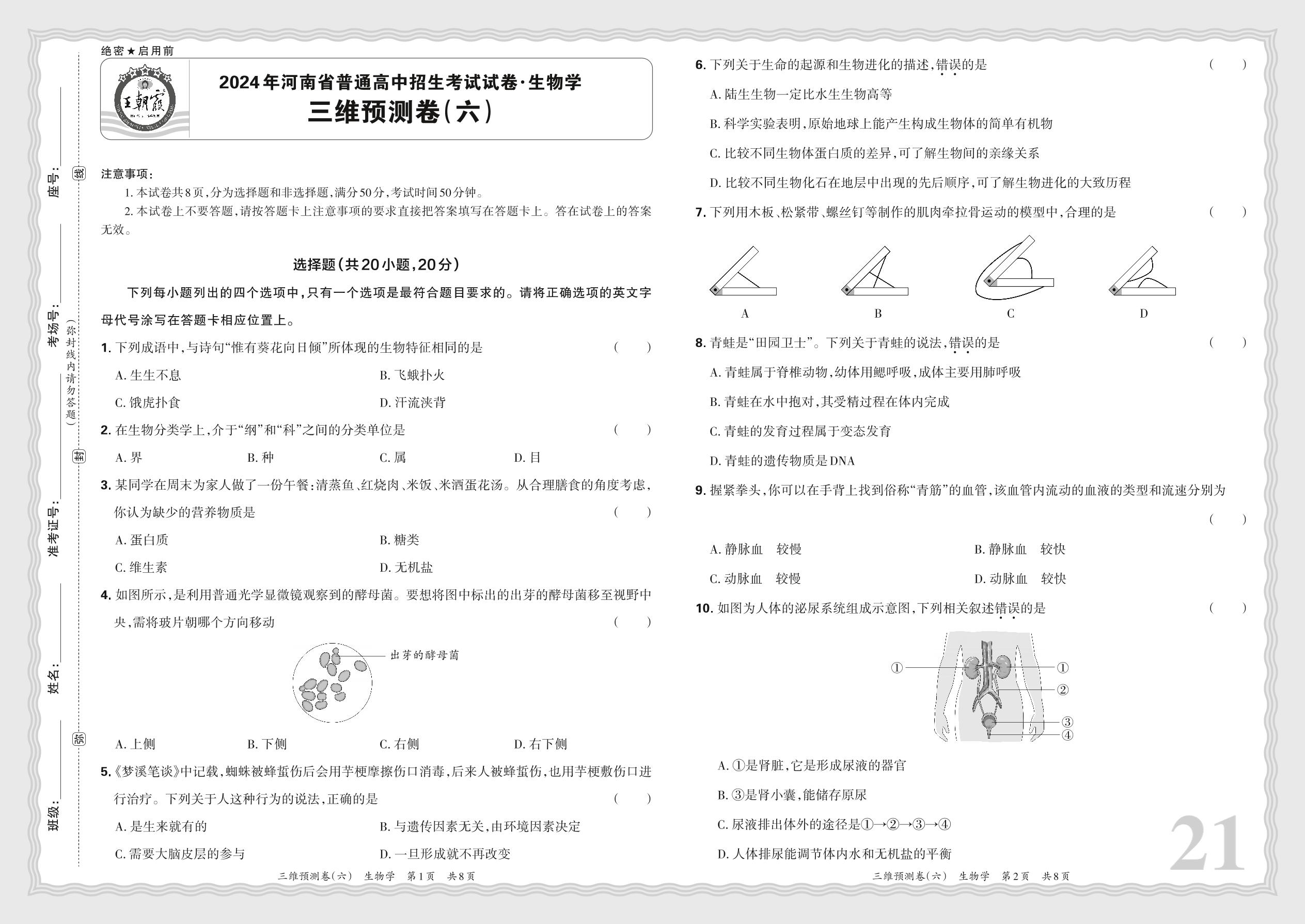 2024年河南省普通高中招生考试试卷·生物学 三维预测卷(六)