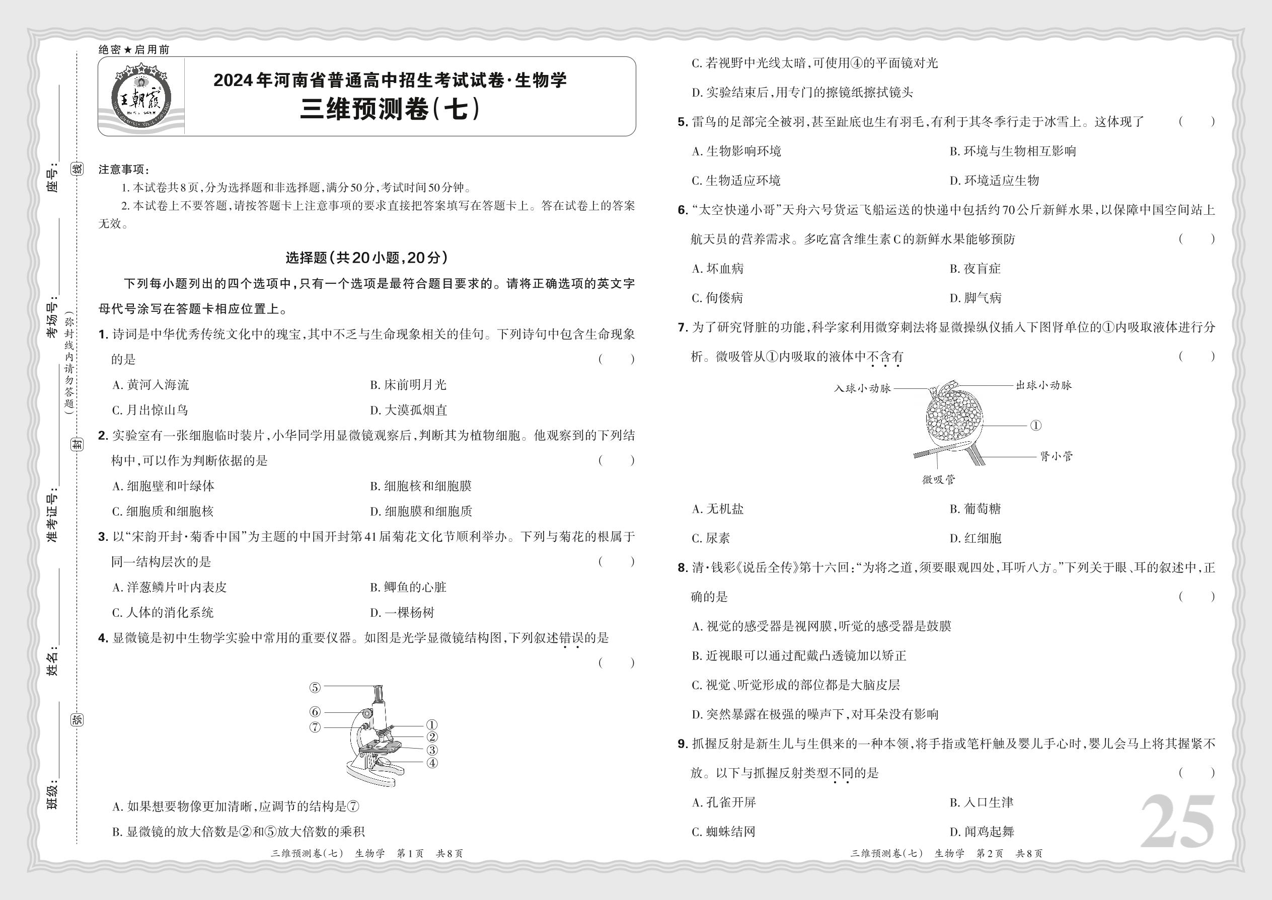 2024年河南省普通高中招生考试试卷·生物学 三维预测卷(七)
