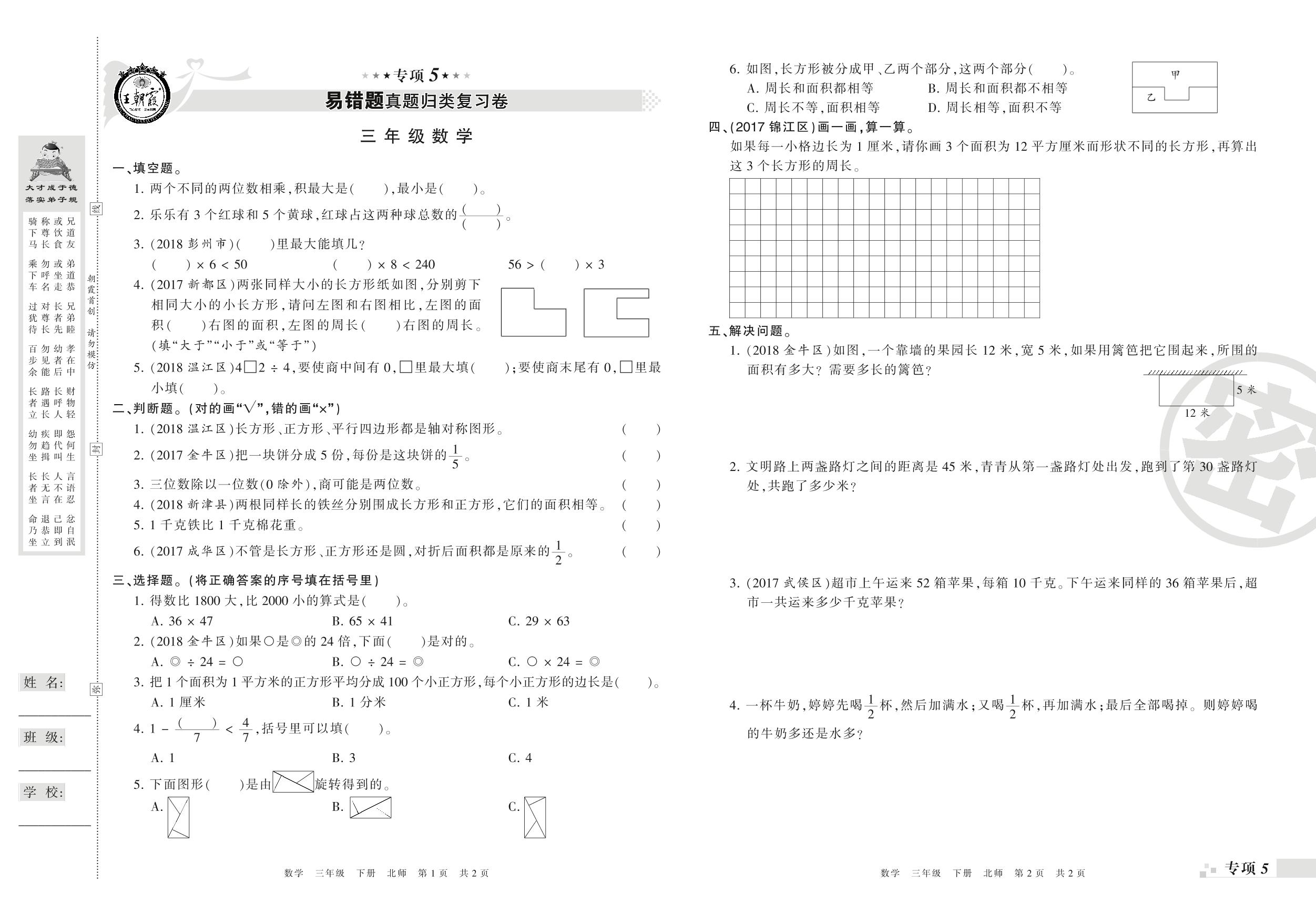 王朝霞期末专项卷——易错题、能力拔高真题归类复习卷三年级下册数学(北师版)_R210804102815【0】