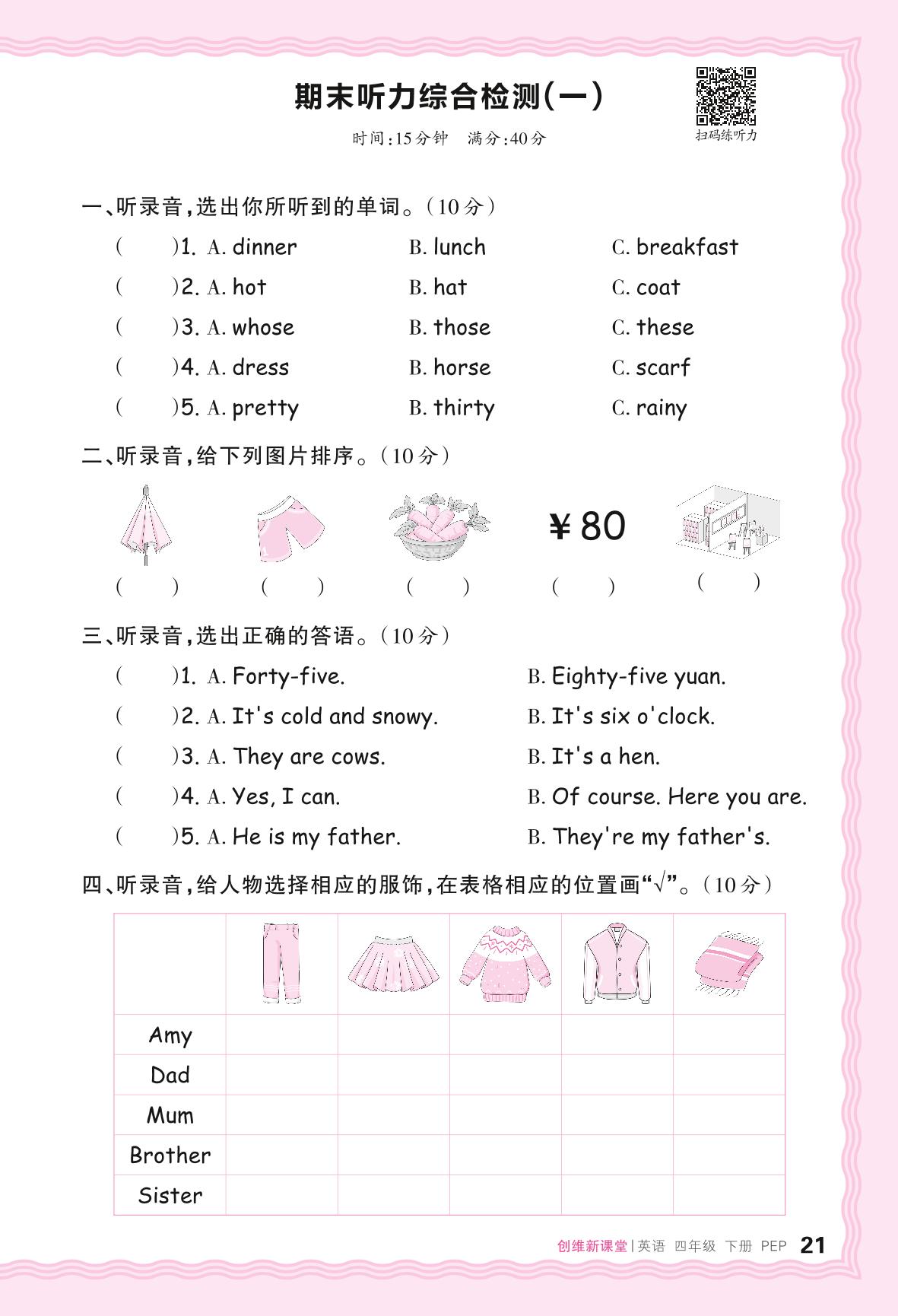 2024春下册四年级英语人教PEP版 期末听力综合检测(一)