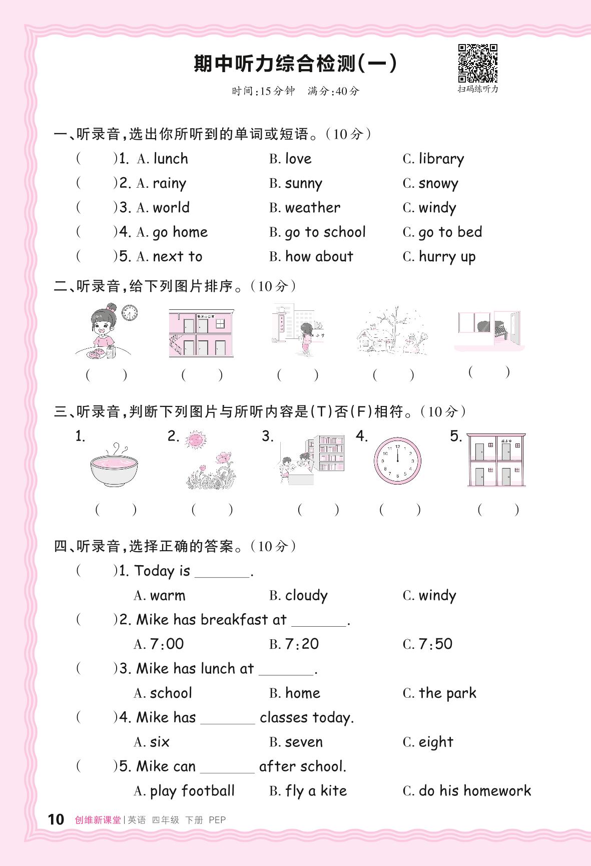 2024春下册四年级英语人教PEP版 期中听力综合检测(一)