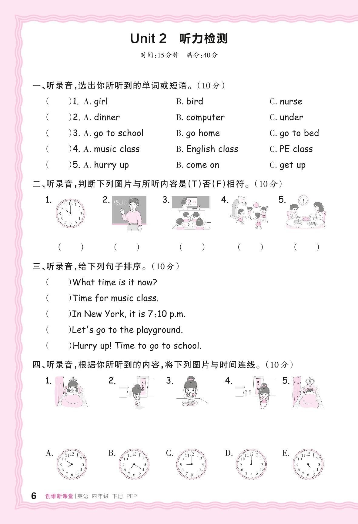 2024春下册四年级英语人教PEP版 Unit 2 听力检测