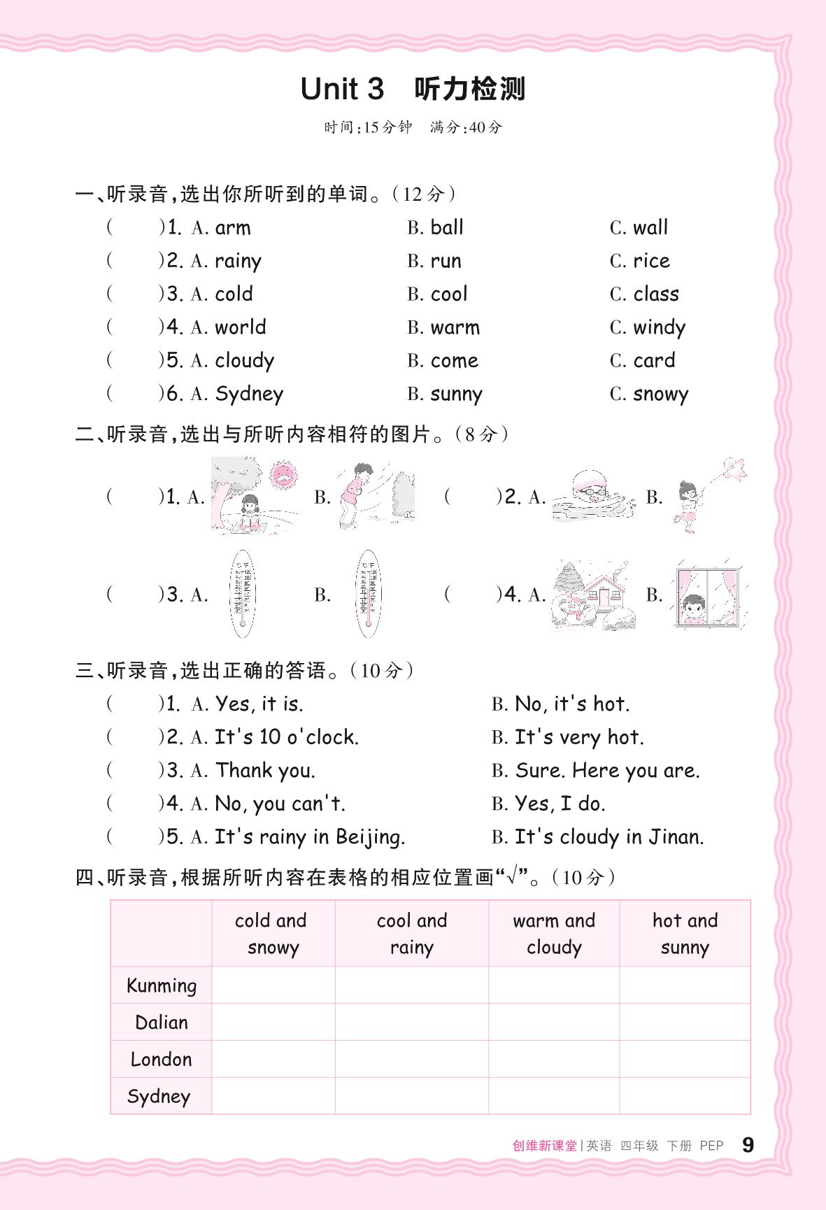 2024春下册四年级英语人教PEP版 Unit 3 听力检测