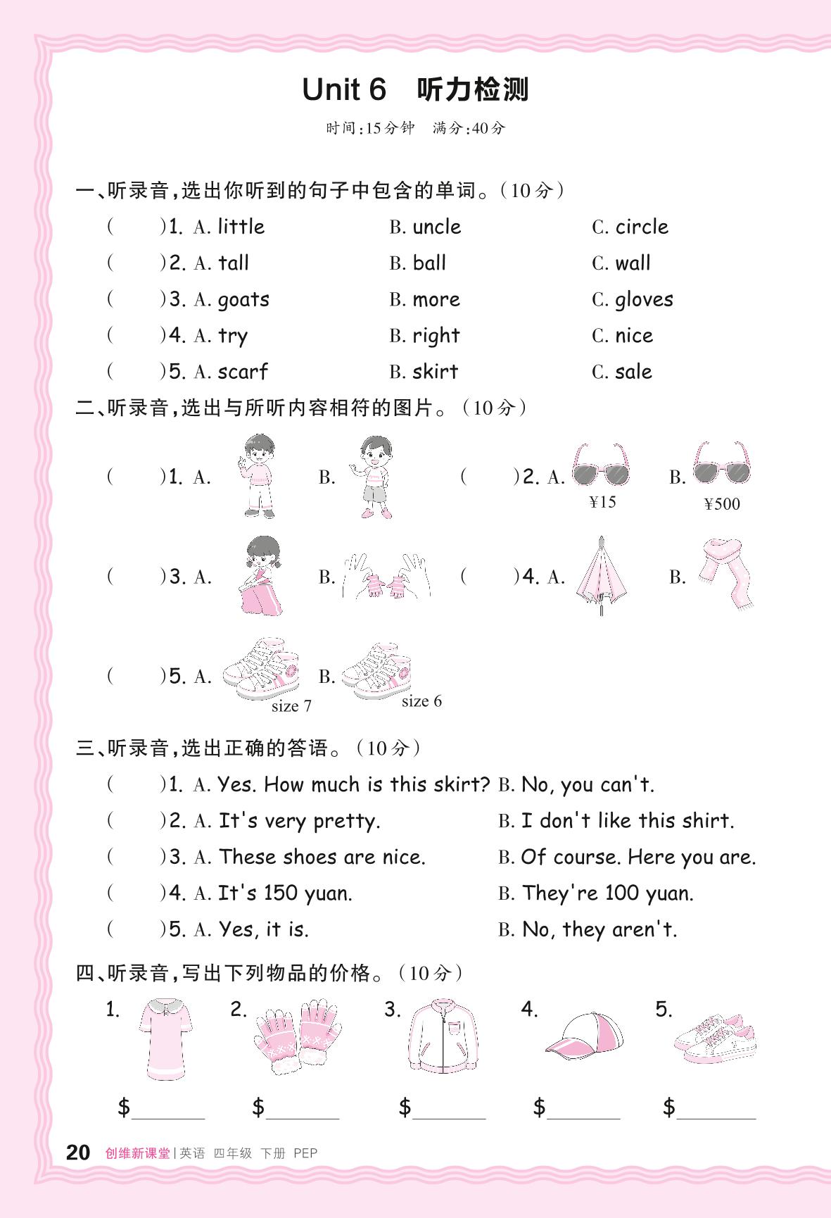 2024春下册四年级英语人教PEP版 Unit 6 听力检测