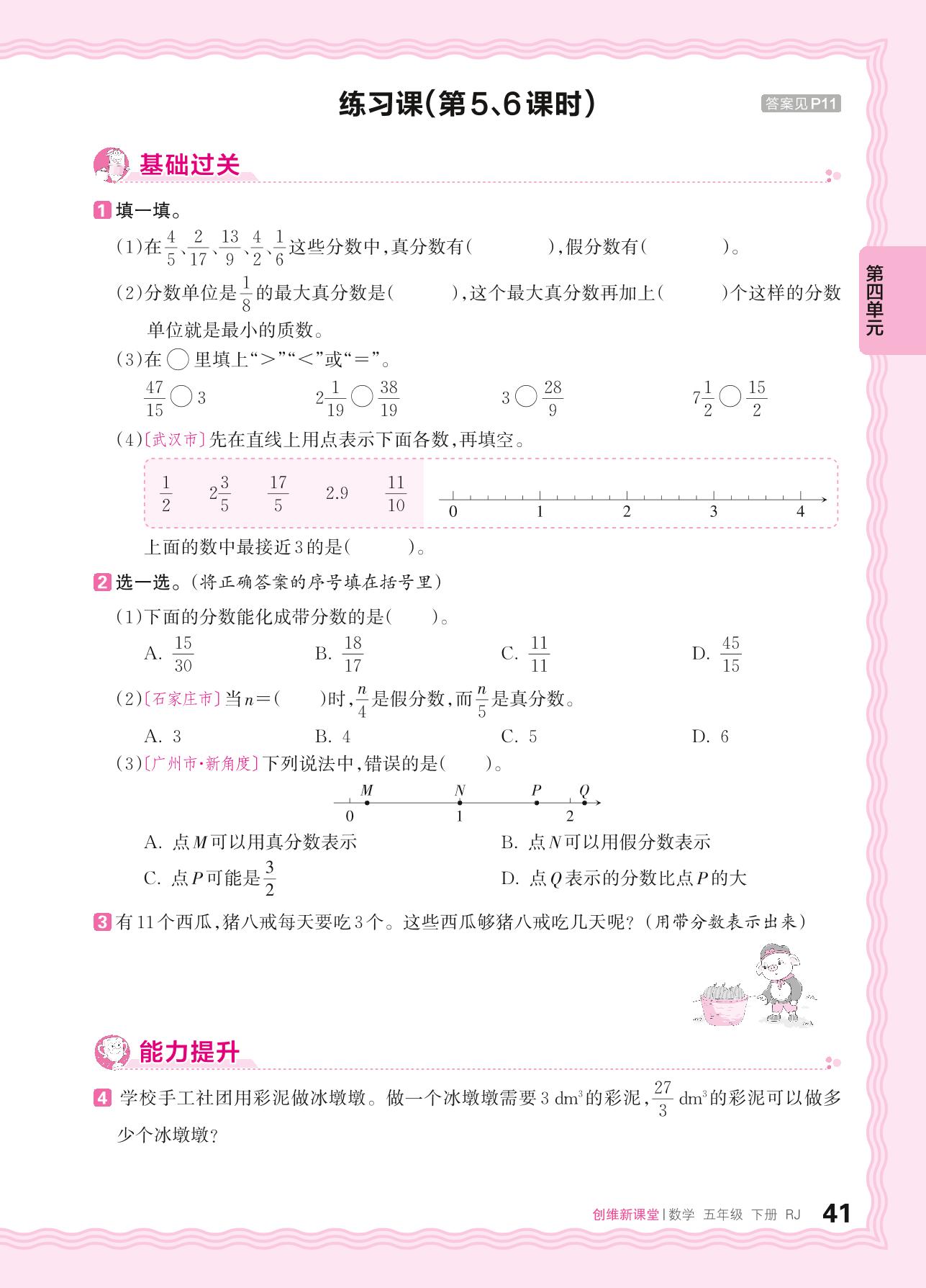 2024春下册五年级数学人教版 第四单元 分数的意义和性质——真分数和假分数 假分数化成整数、带分数练习课
