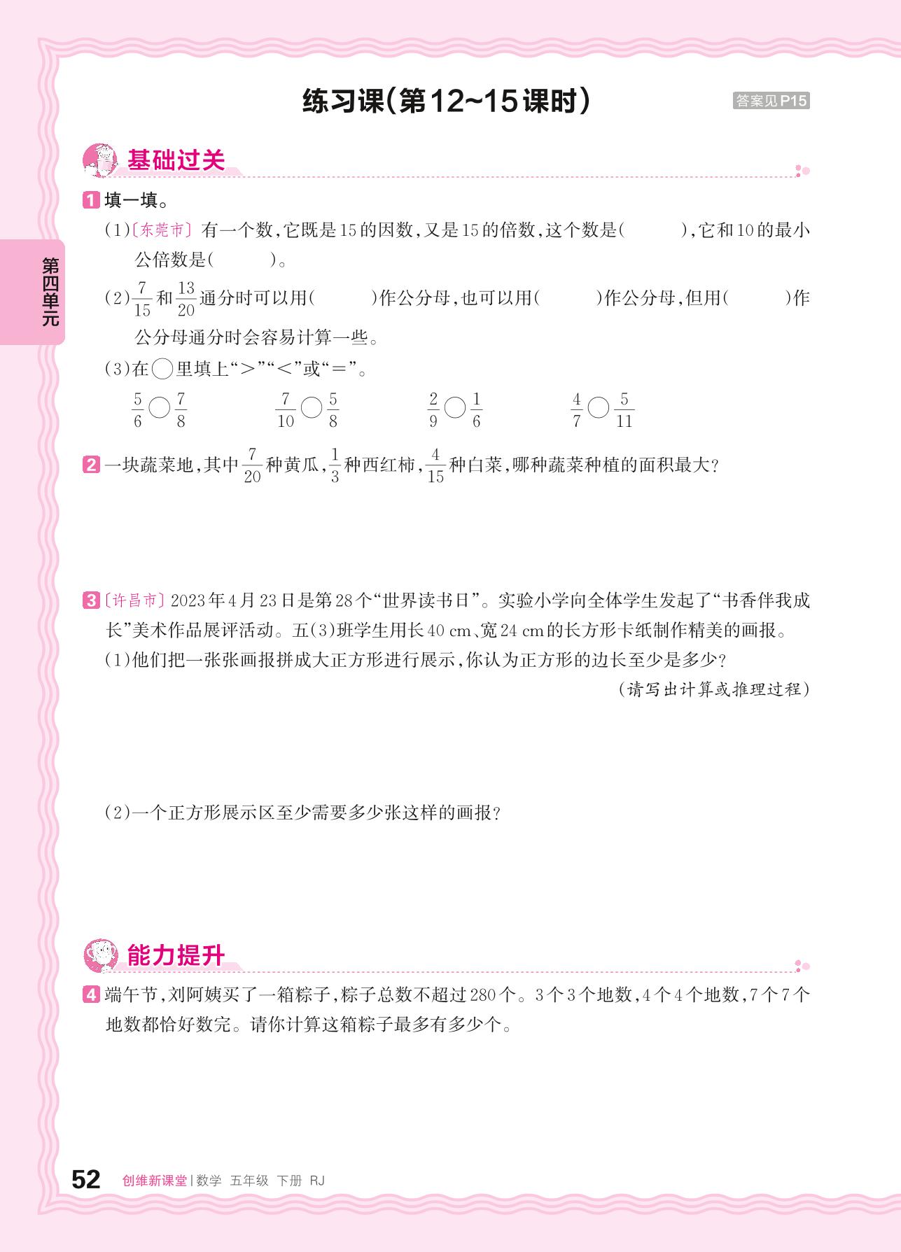 2024春下册五年级数学人教版 第四单元 分数的意义和性质——最小公倍数、最小公倍数的应用、通分练习课