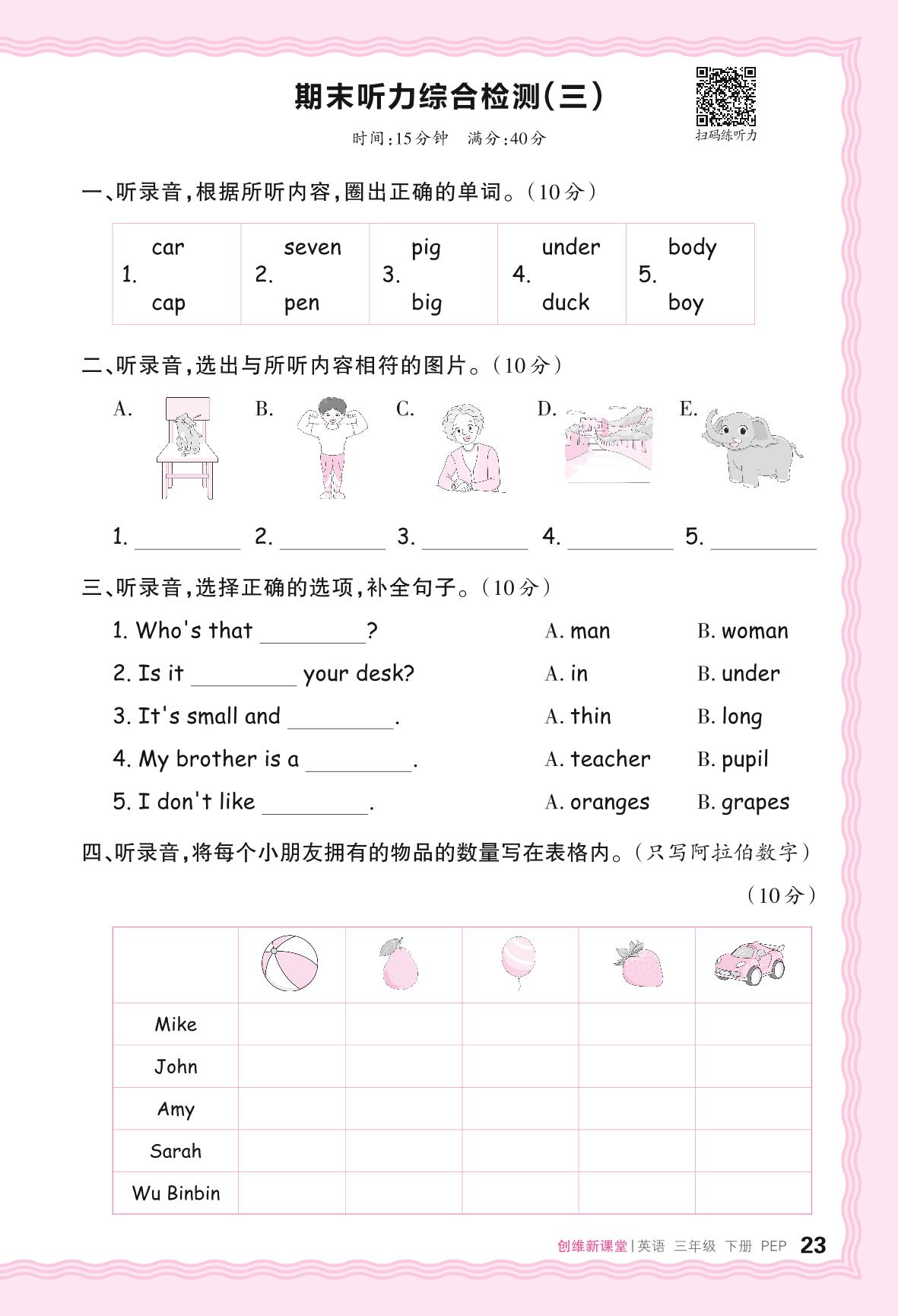 2024春下册三年级英语人教PEP版 期末听力综合检测(三)