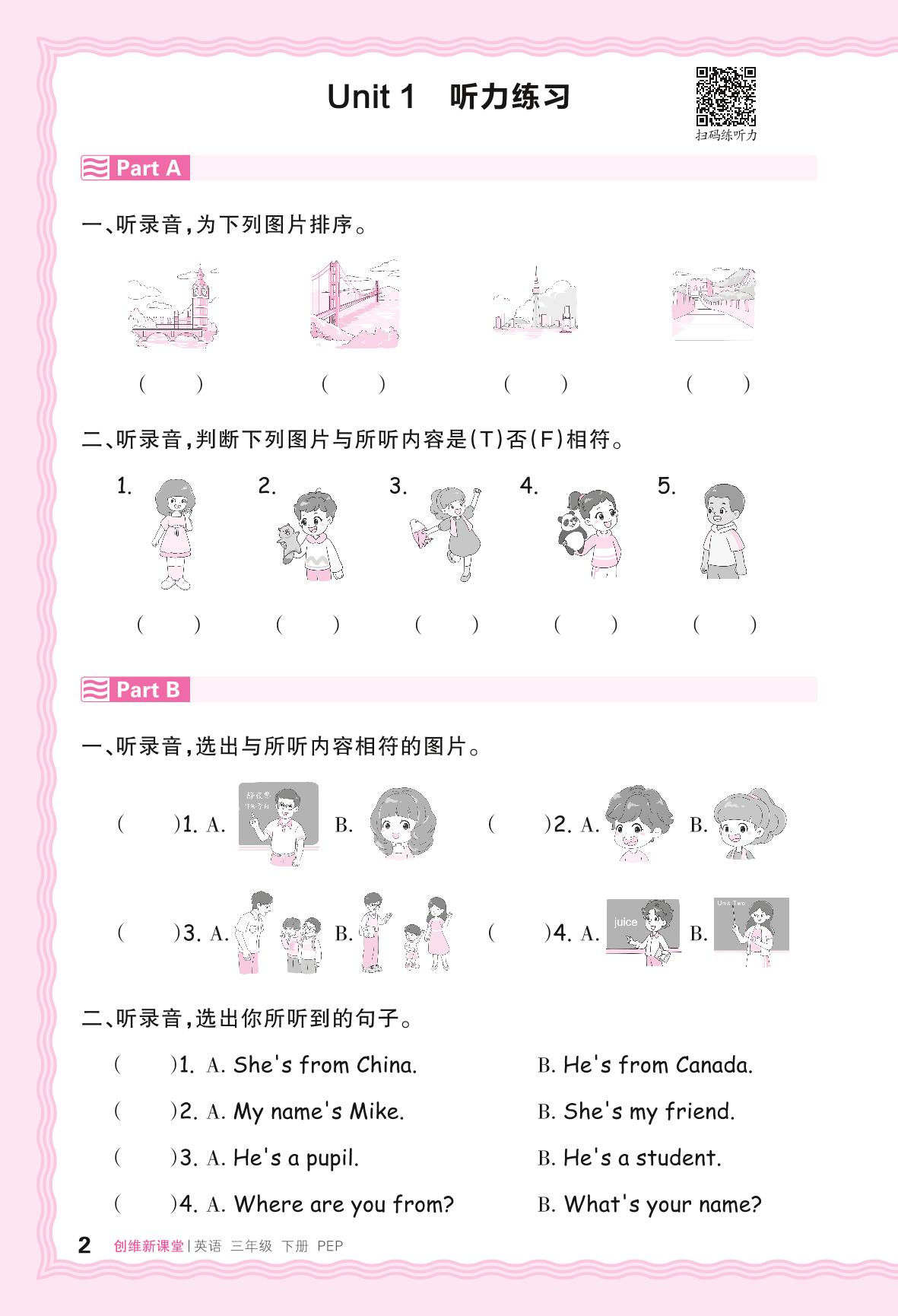 2024春下册三年级英语人教PEP版 Unit 1 听力练习
