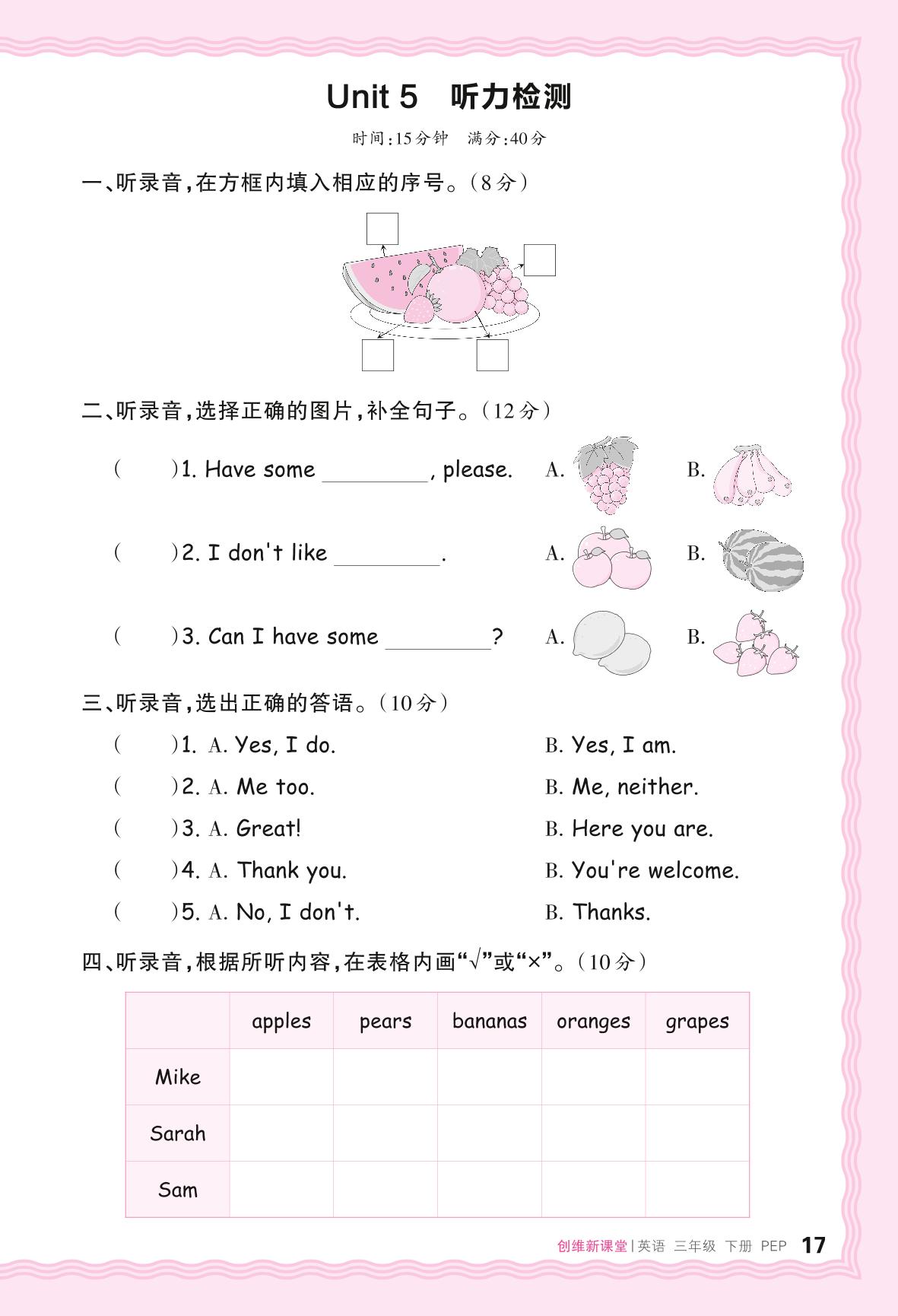 2024春下册三年级英语人教PEP版 Unit 5 听力检测