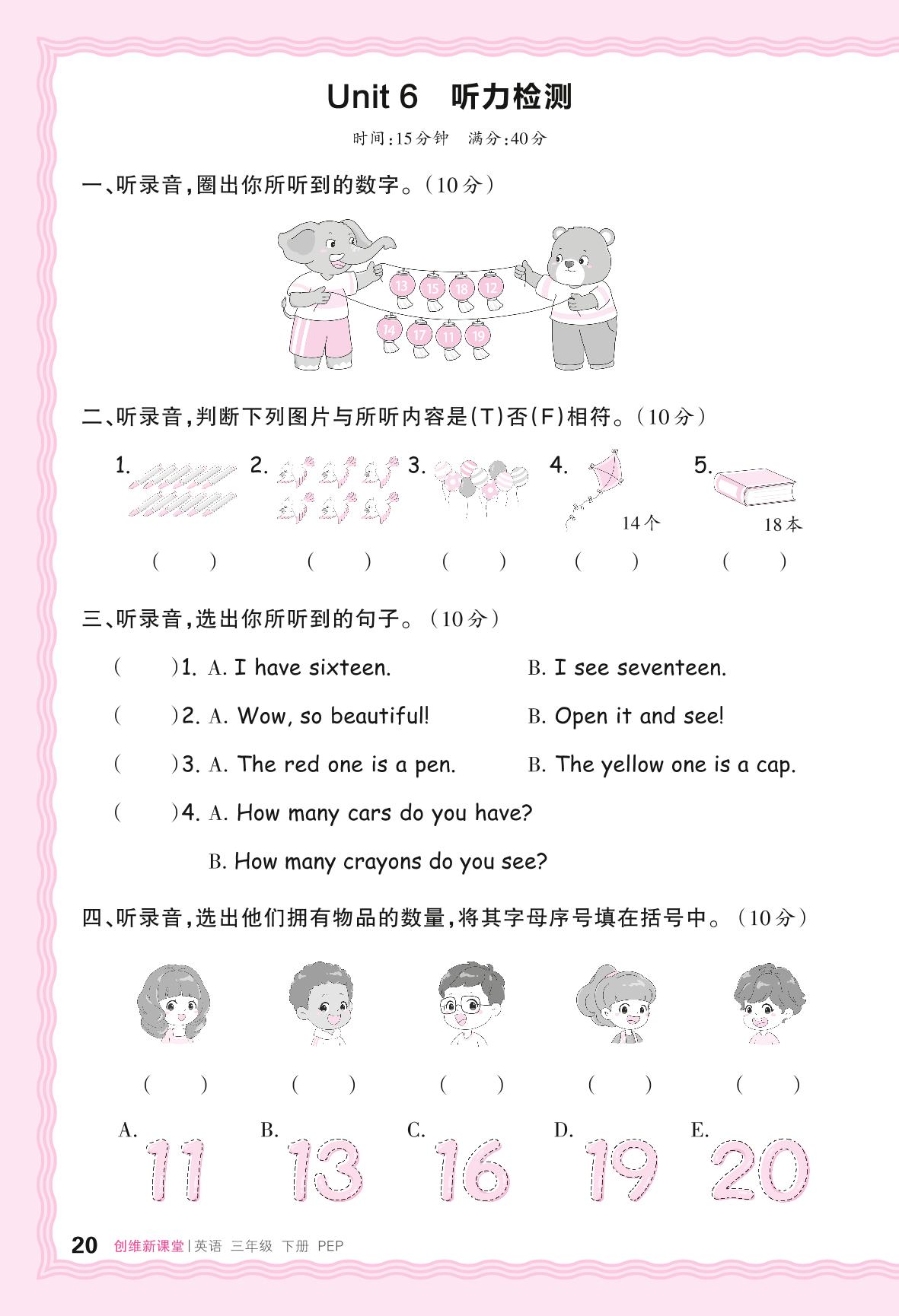 2024春下册三年级英语人教PEP版 Unit 6 听力检测