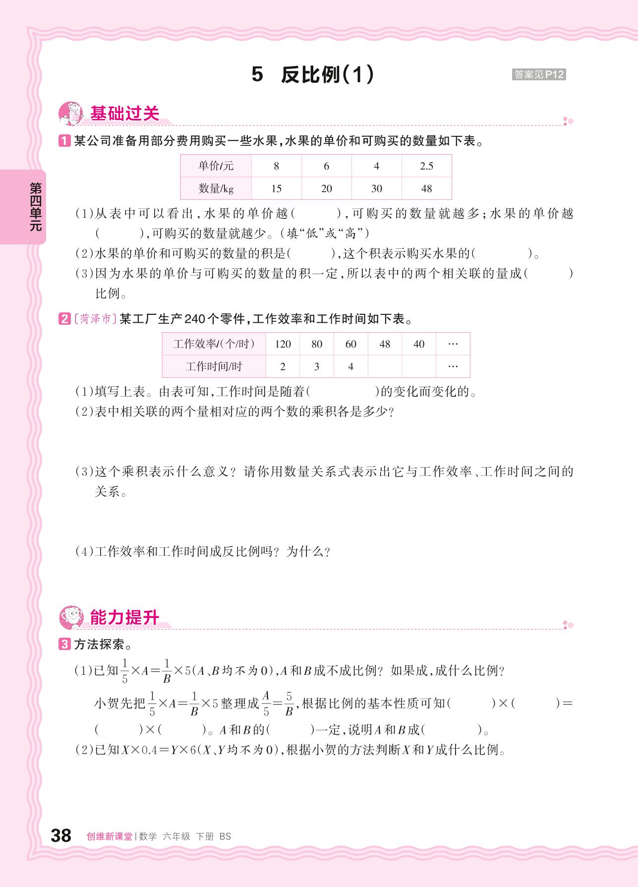 2024春下册六年级数学北师版 第四单元 正比例与反比例——5. 反比例(1)