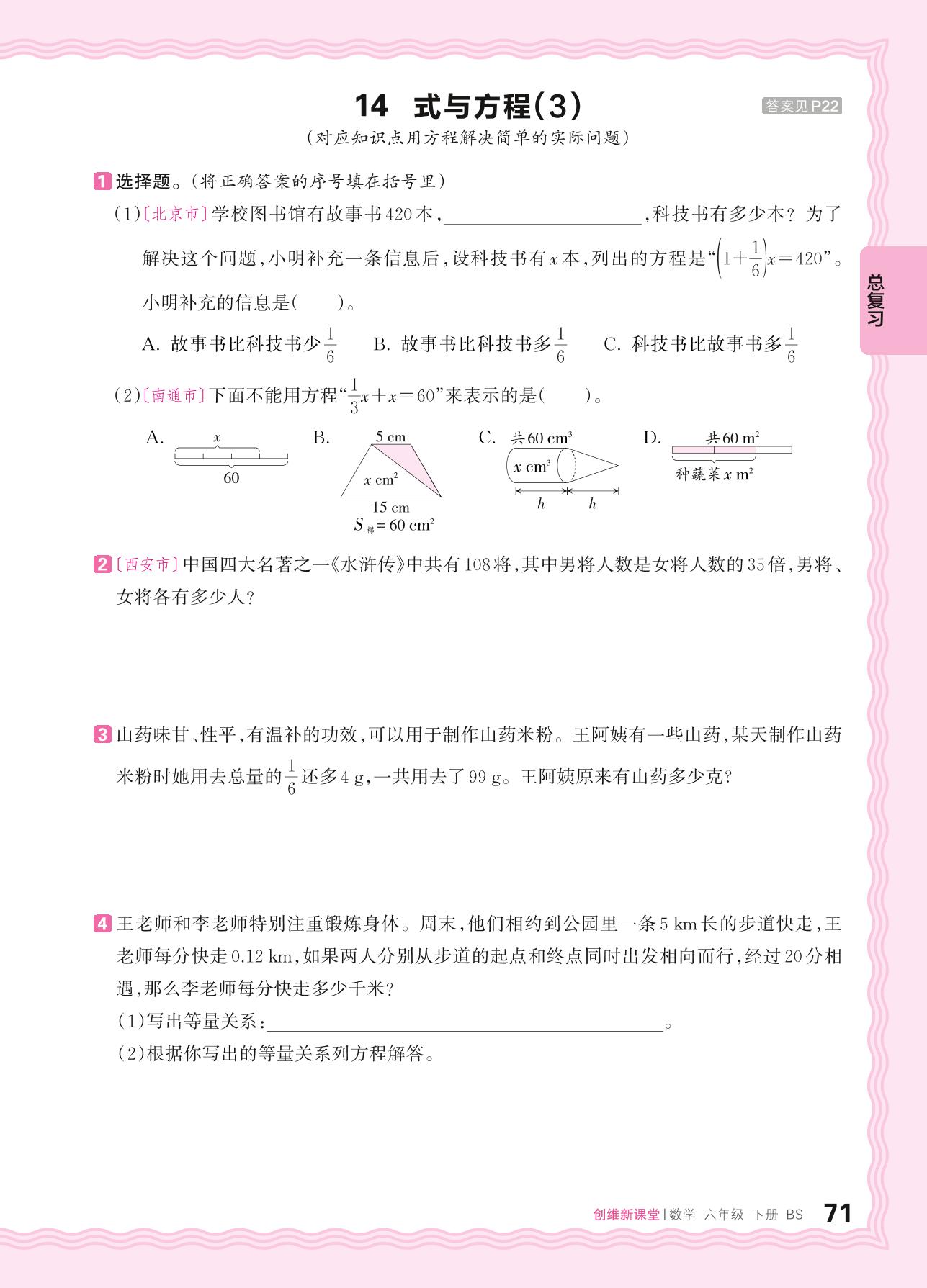 2024春下册六年级数学北师版 总复习(数与代数)——14. 式与方程(3)