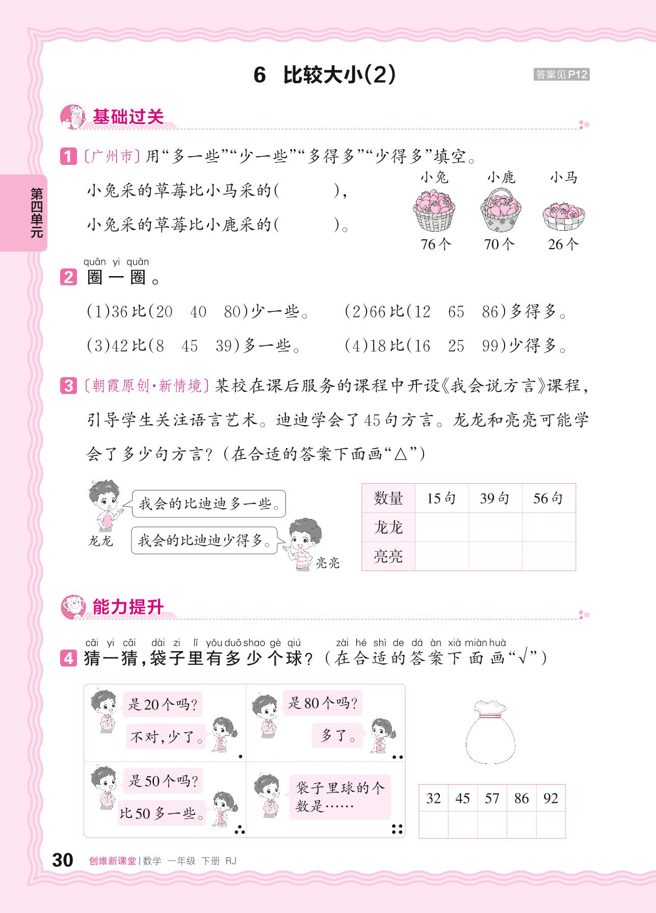 2024春下册一年级数学人教版 第四单元 100以内数的认识——6. 比较大小(2)