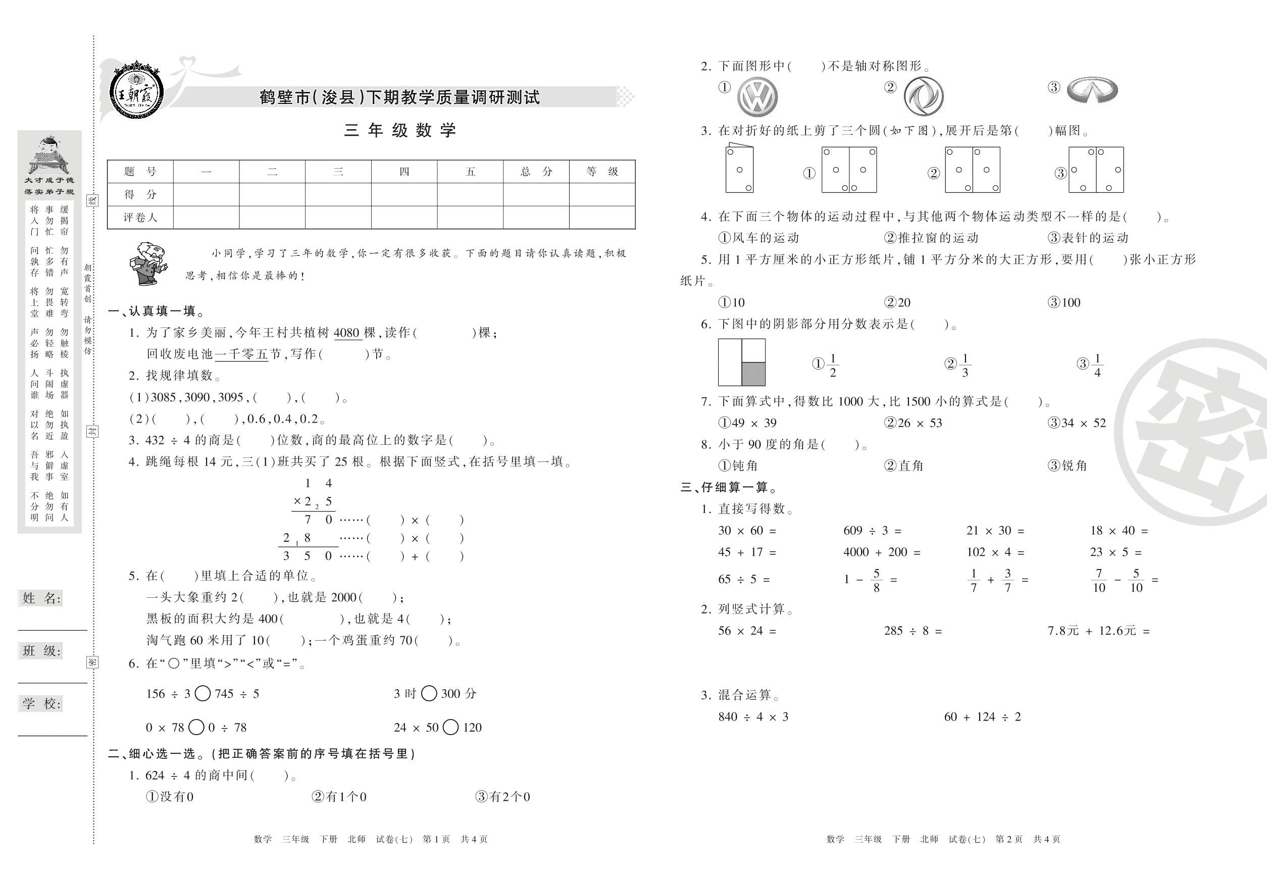 2015-2016学年第二学期鹤壁市(浚县)三年级数学试卷(北师版)【7】
