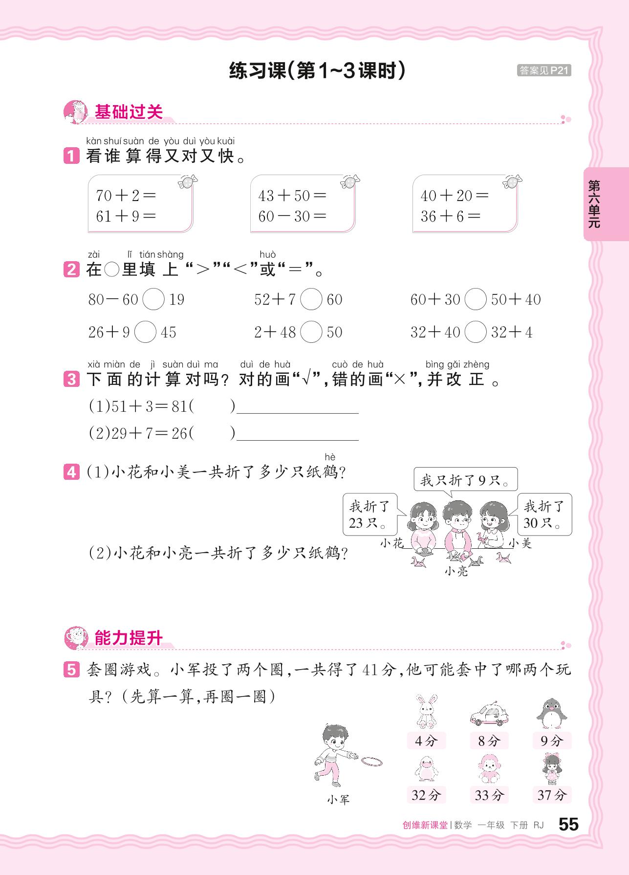 2024春下册一年级数学人教版 第六单元 100以内的加法和减法(一)——整十数加、减整十数 两位数加一位数(不进位)、整十数 两位数加一位数(进位)练习课