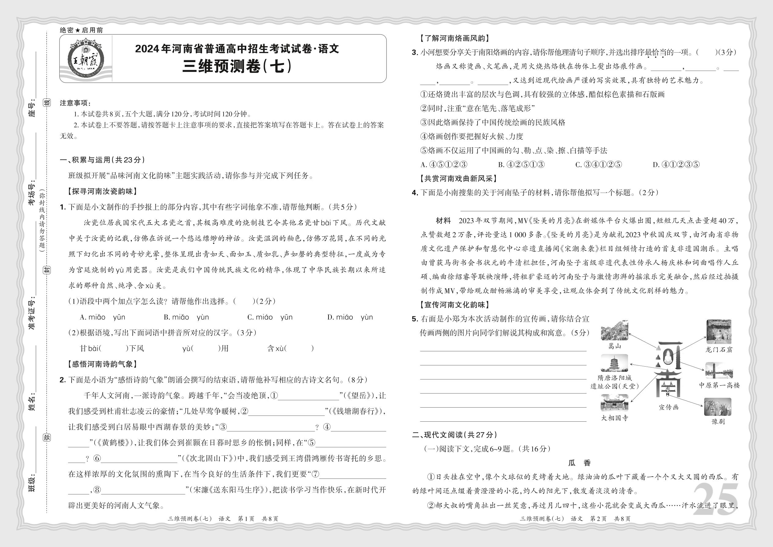 2024年河南省普通高中招生考试试卷·语文 三维预测卷(七)