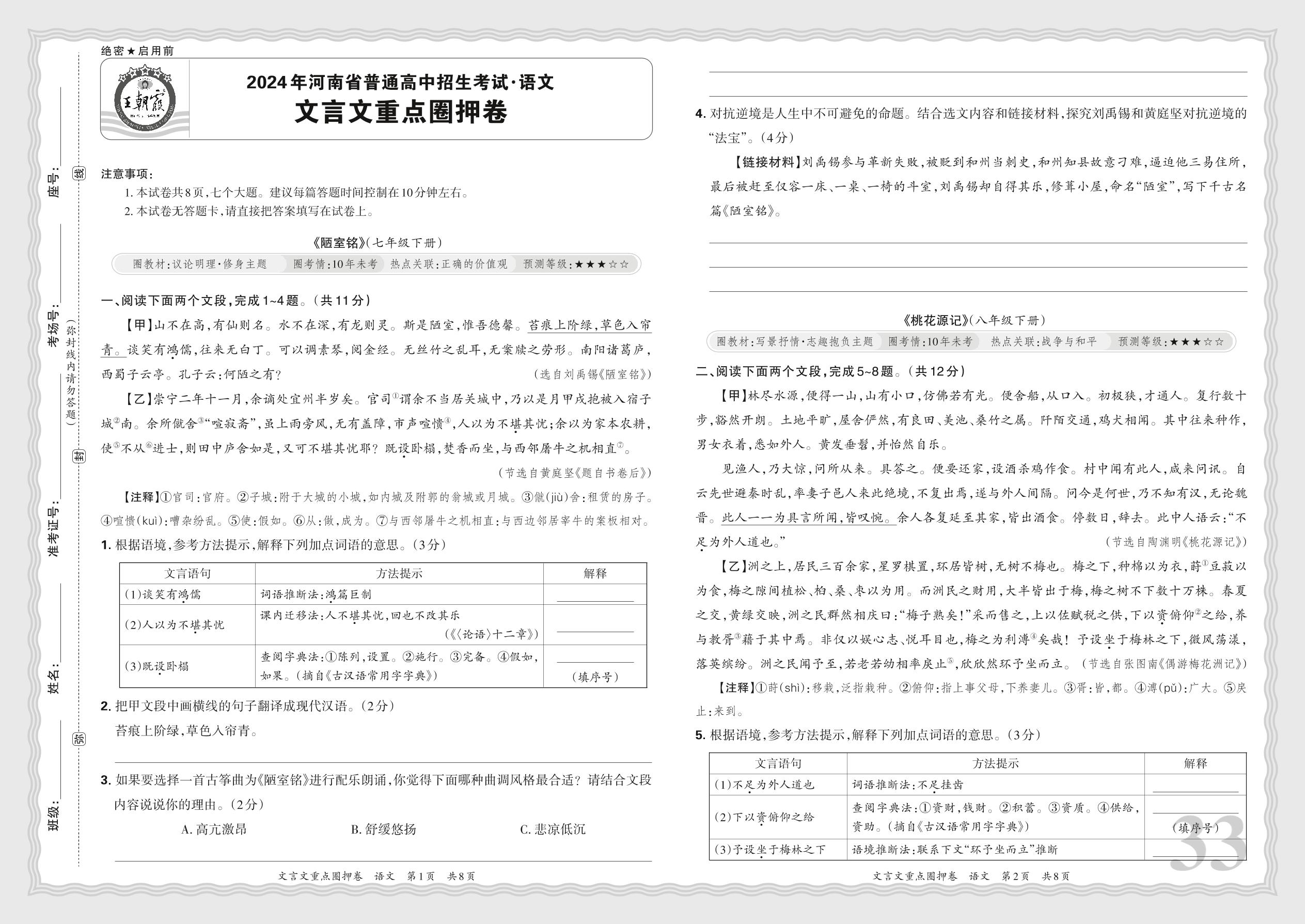 2024年河南省普通高中招生考试试卷·语文 文言文重点圈押卷