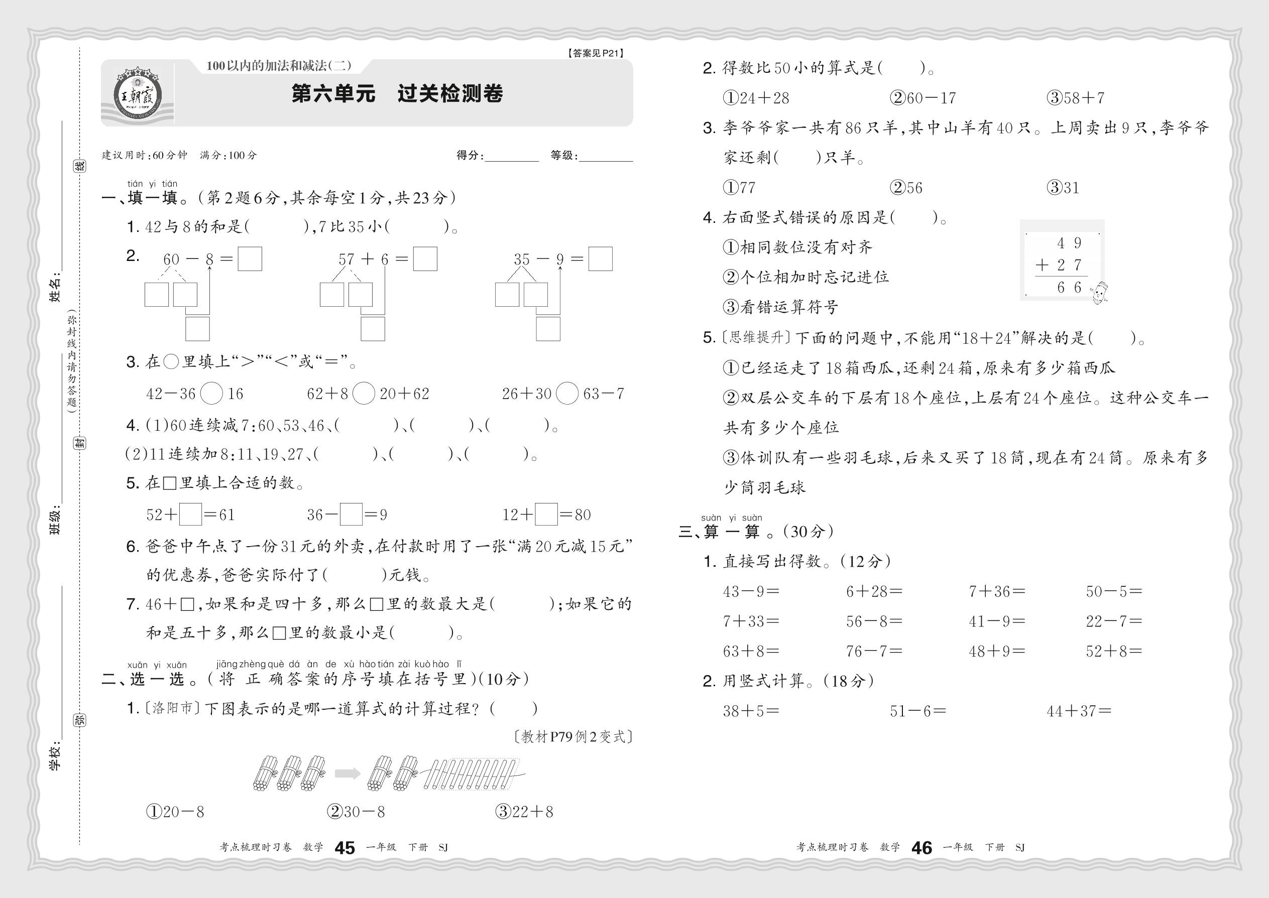 2024春下册一年级数学苏教版 第六单元 过关检测卷