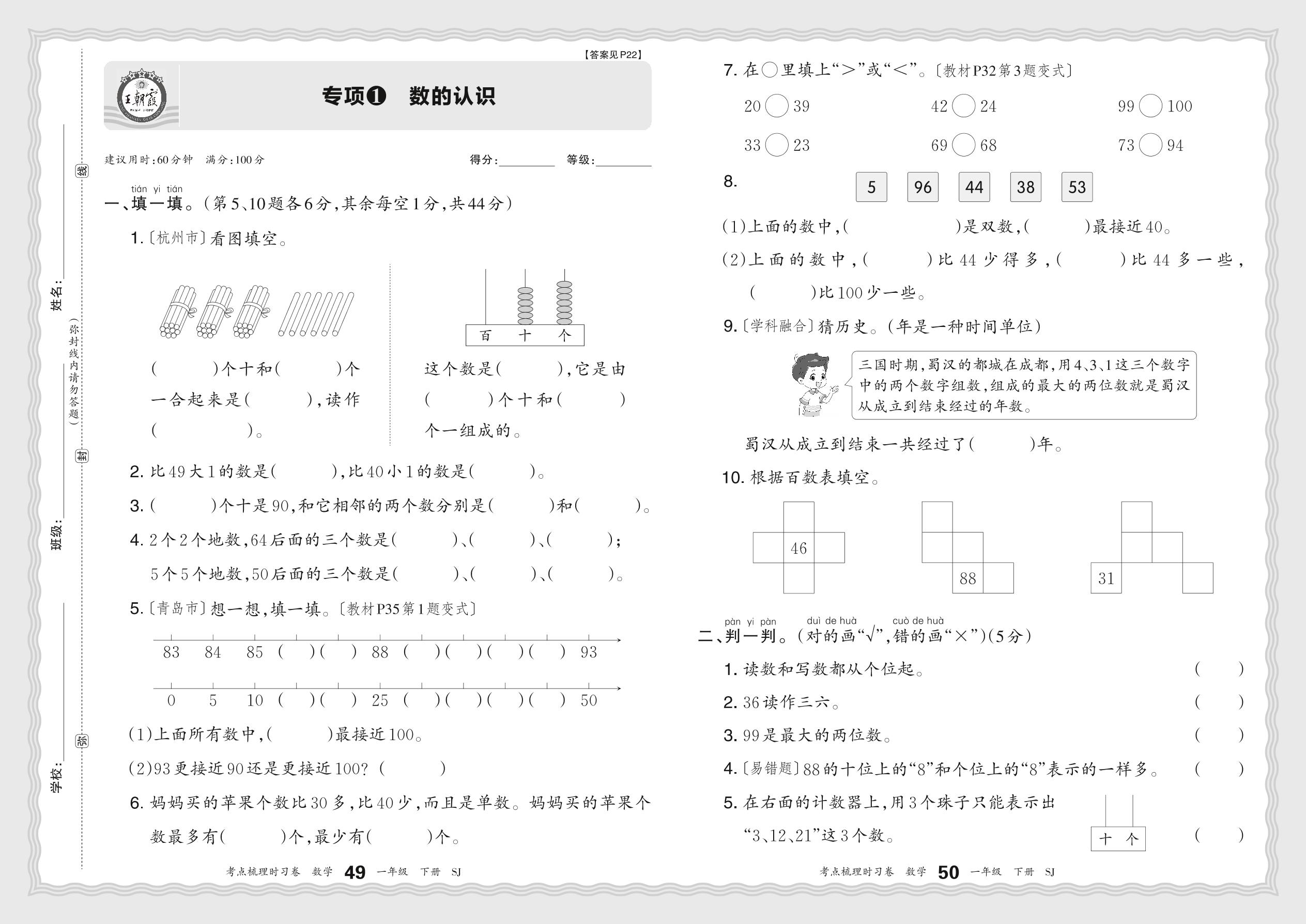 一年级数学苏教版下册专项卷