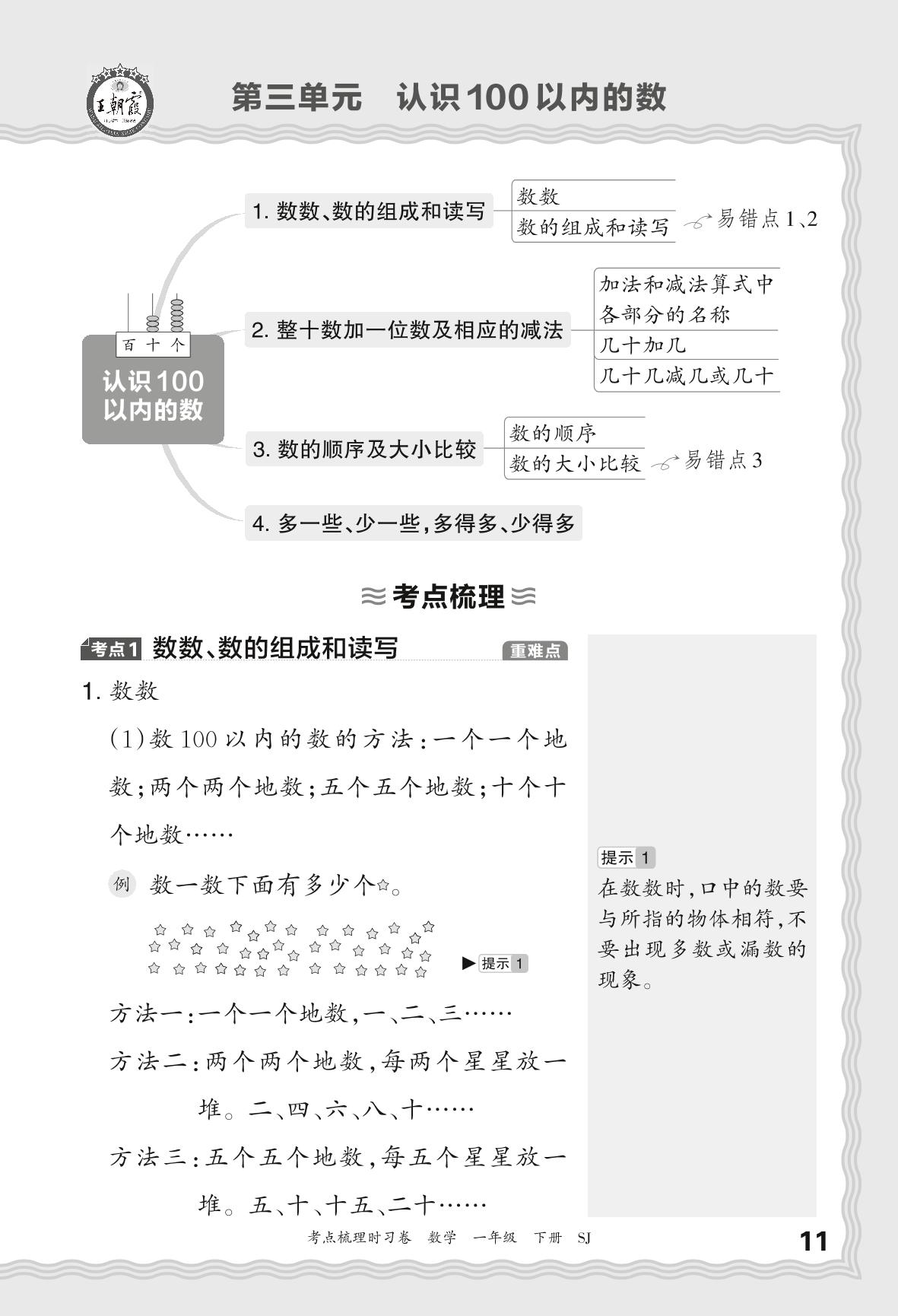 2024春下册一年级数学苏教版 考点梳理手册——第三单元 认识100以内的数