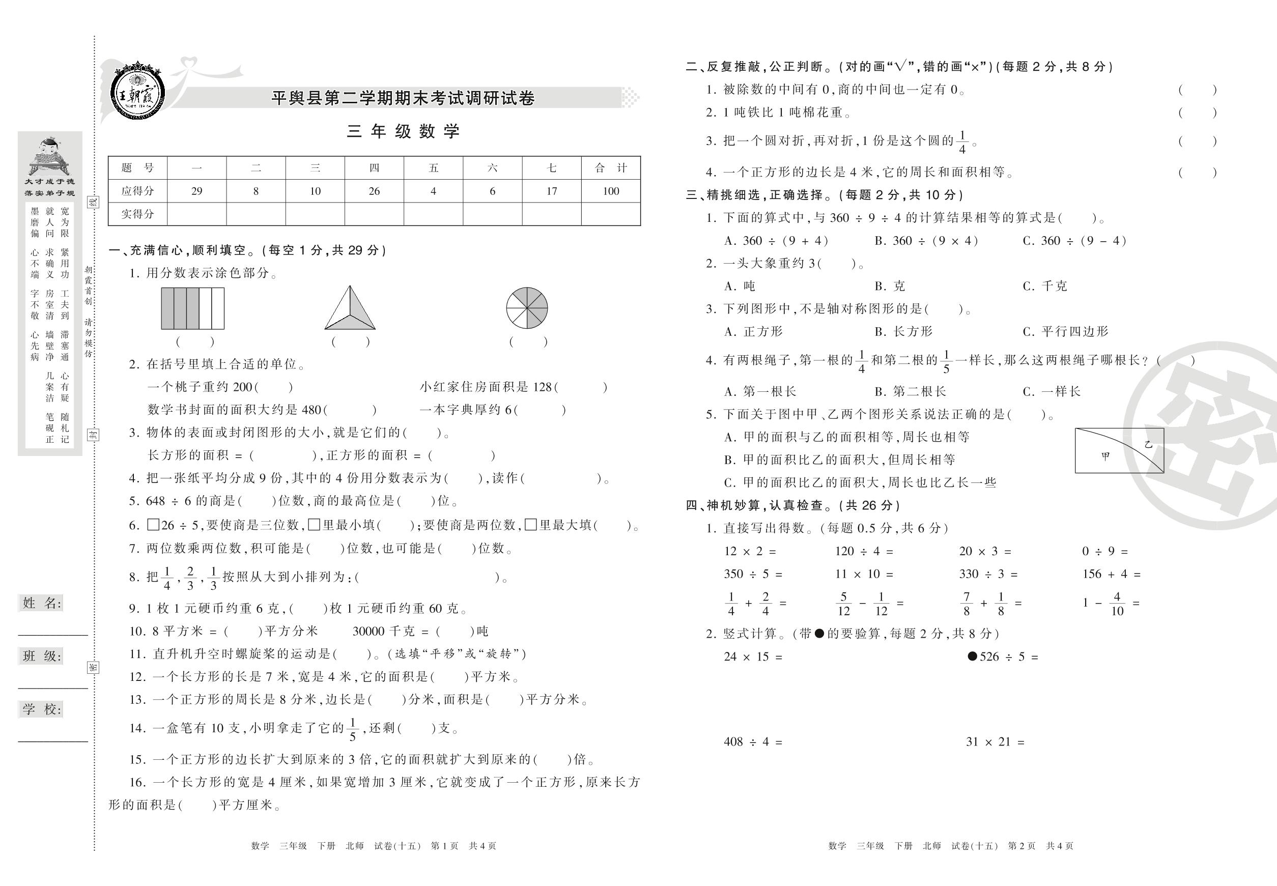 2015-2016学年第二学期驻马店市平舆县三年级数学试卷(北师版)【15】
