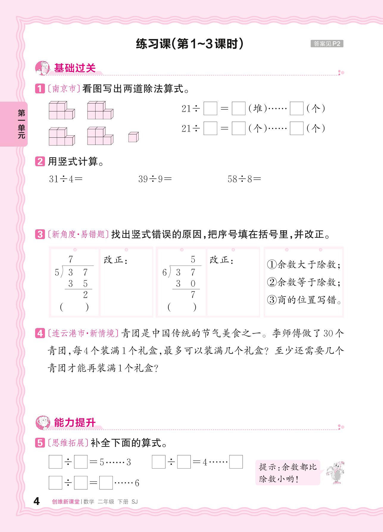 2024春下册二年级数学苏教版 第一单元 有余数的除法——第一单元练习课