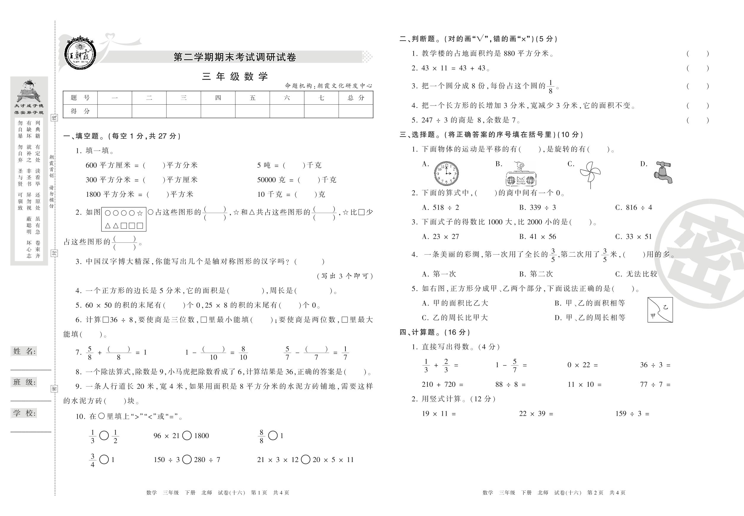王朝霞期末调研卷三年级下册数学(北师版)【16】