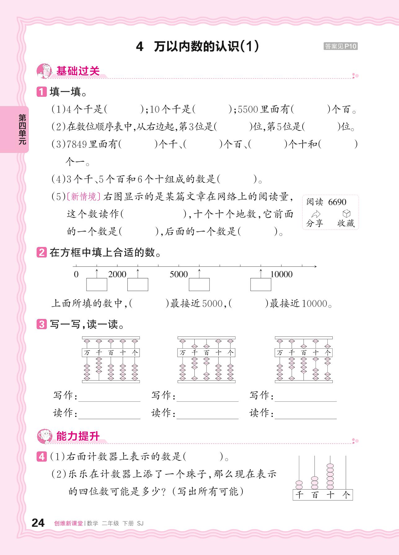 2024春下册二年级数学苏教版 第四单元 认识万以内的数——4. 万以内数的认识(1)