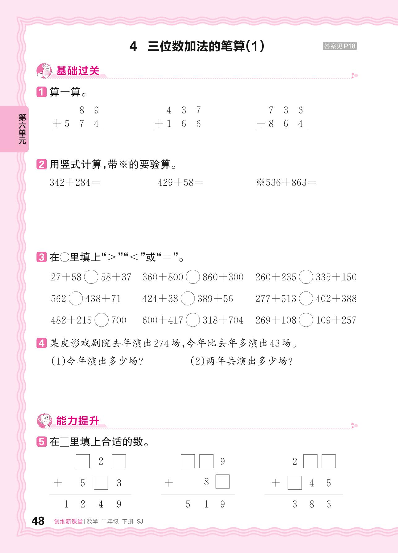 2024春下册二年级数学苏教版 第六单元 两、三位数的加法和减法——4. 三位数加法的笔算(1)