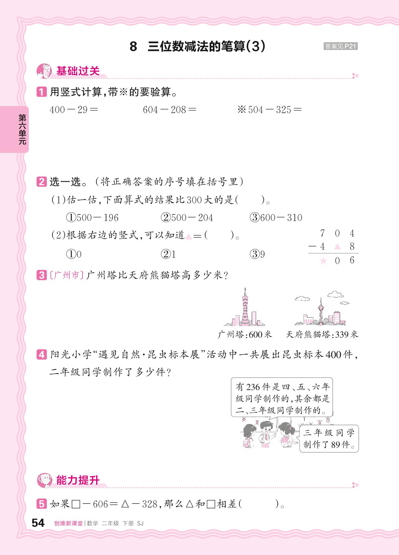 2024春下册二年级数学苏教版 第六单元 两、三位数的加法和减法——8. 三位数减法的笔算(3)