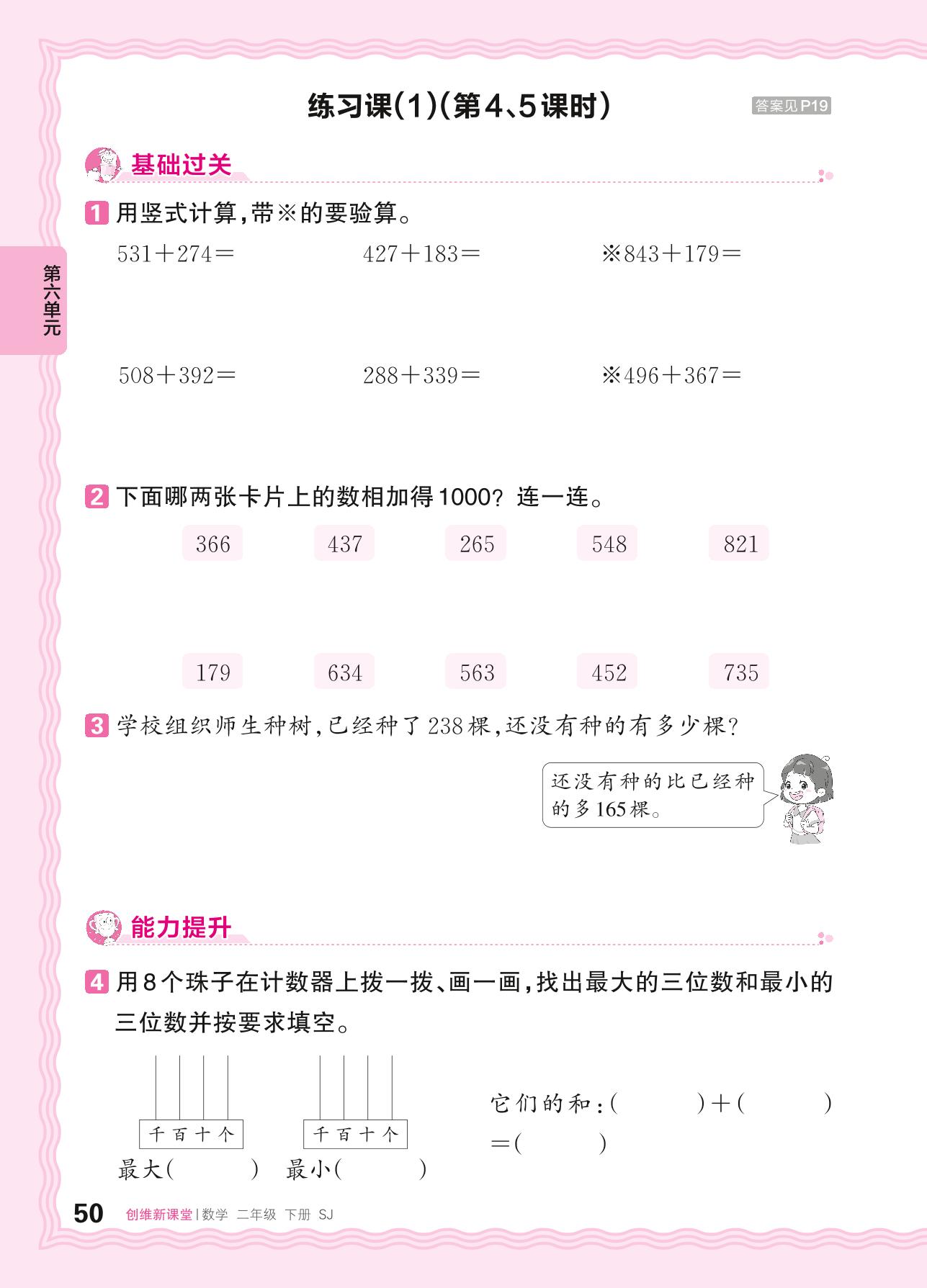 2024春下册二年级数学苏教版 第六单元 两、三位数的加法和减法——三位数加法的笔算练习课(1)