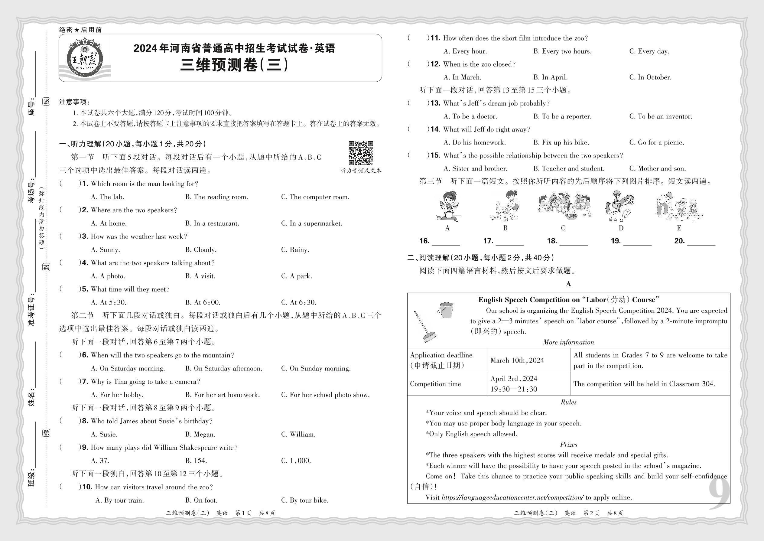 2024年河南省普通高中招生考试试卷·英语 三维预测卷(三)