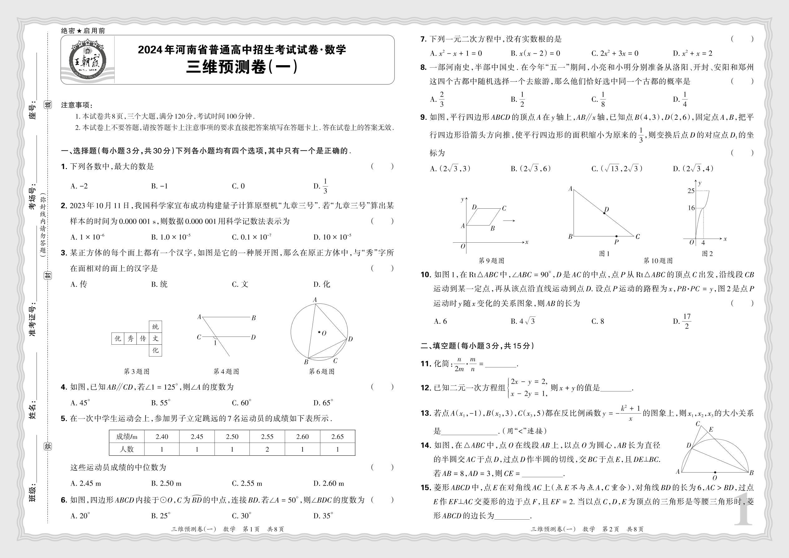 2024年河南省普通高中招生考试试卷·数学 三维预测卷(一)