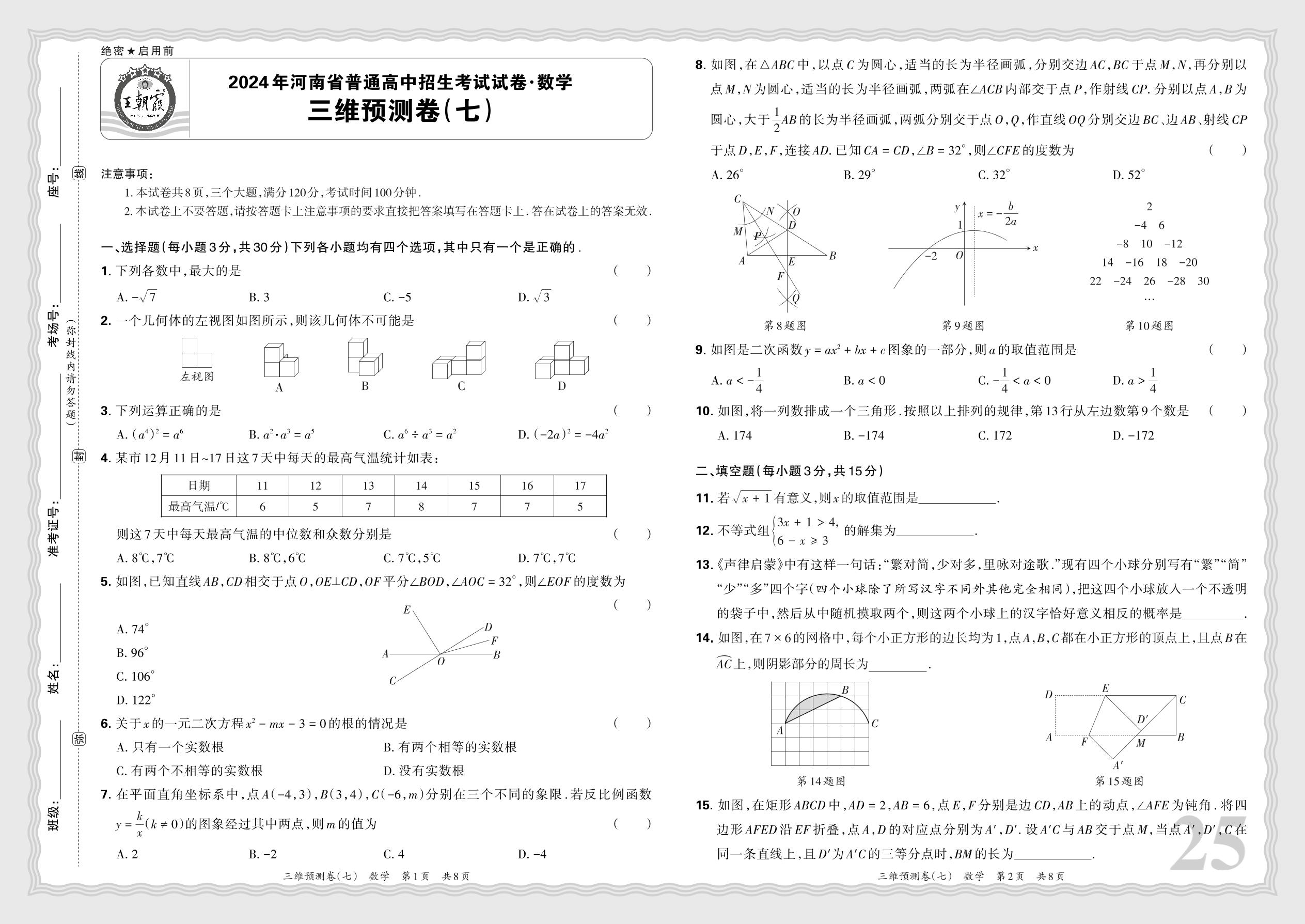 2024年河南省普通高中招生考试试卷·数学 三维预测卷(七)