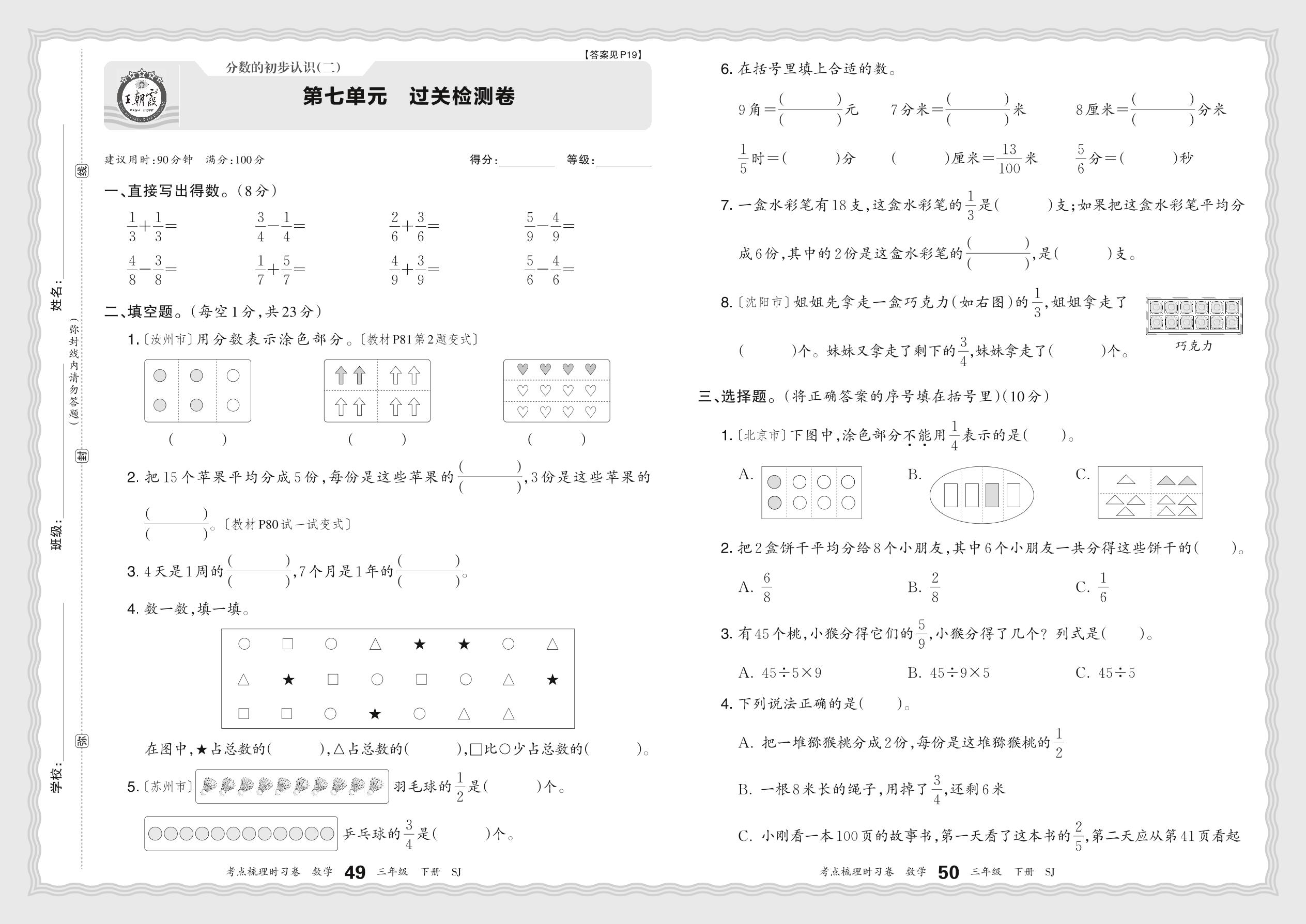 三年级数学苏教版下册单元卷