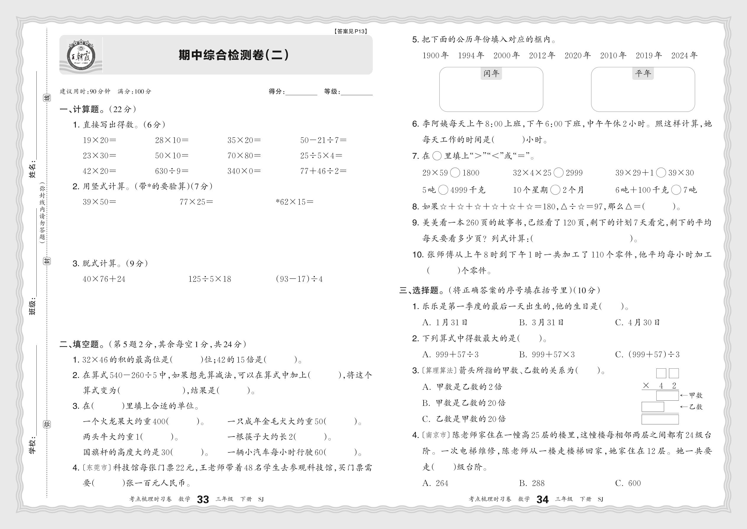 三年级数学苏教版下册期中卷