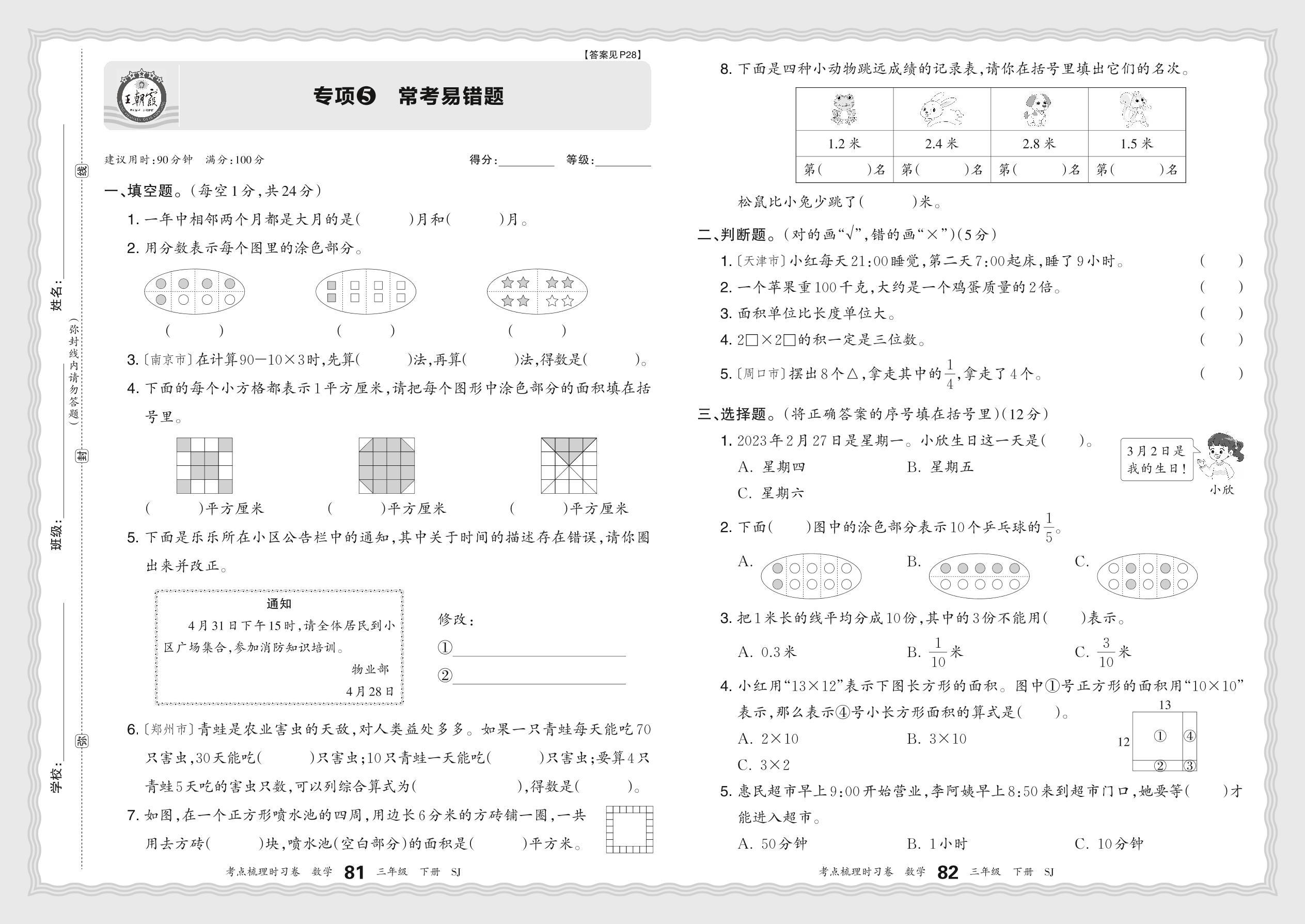 2024春下册三年级数学苏教版 期末专项卷KD版·常考易错题【5】