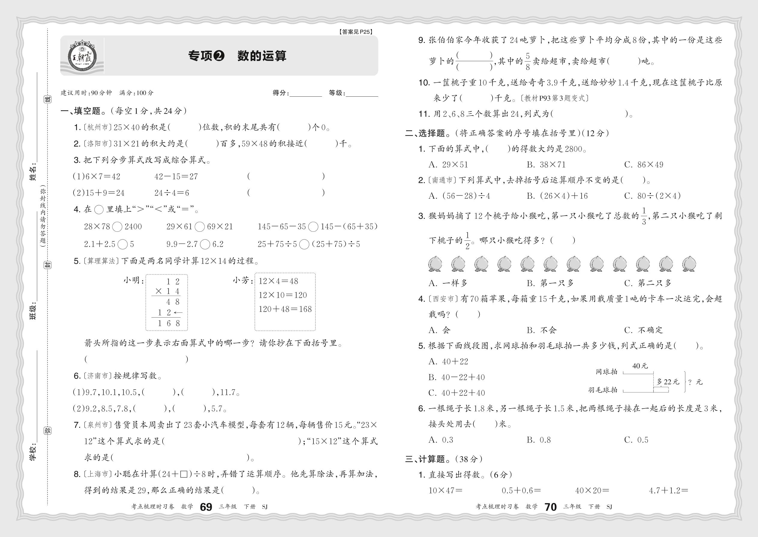 三年级数学苏教版下册专项卷