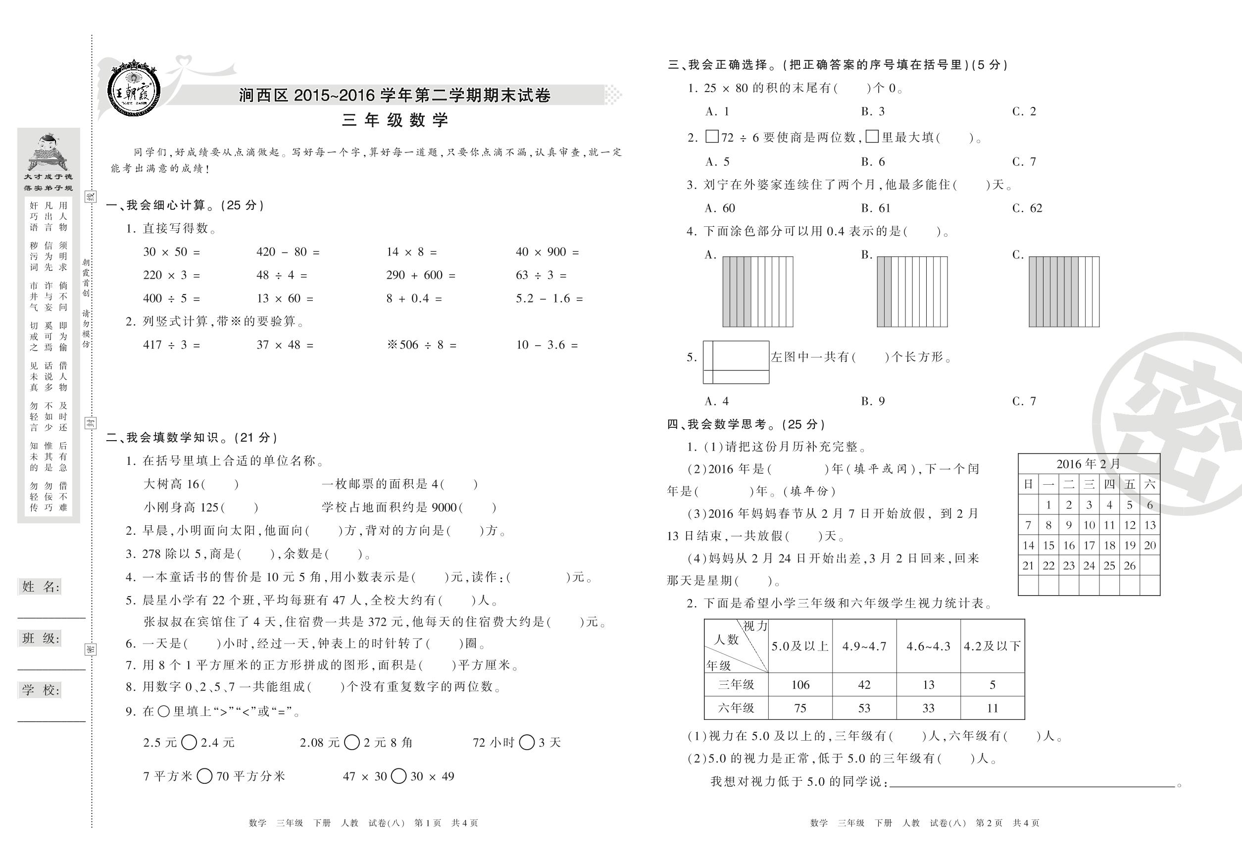 2015-2016学年第二学期洛阳市涧西区三年级数学试卷(人教版)【8】