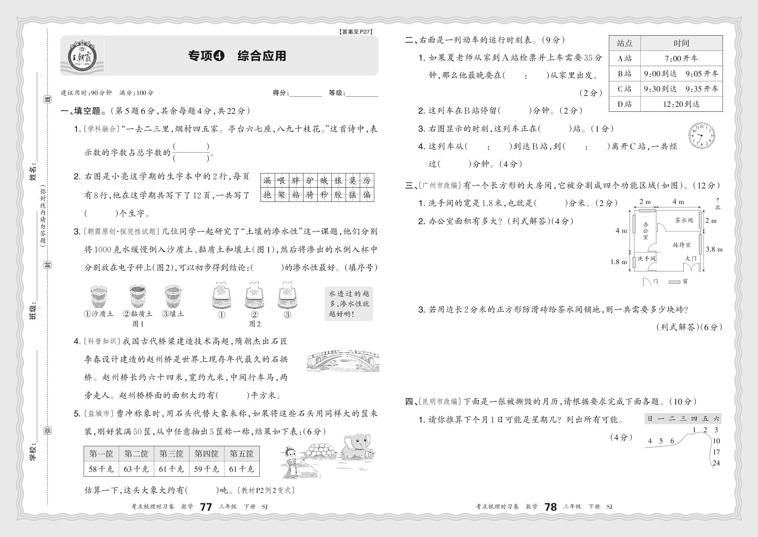 2024春下册三年级数学苏教版 期末专项卷KD版·综合应用【4】