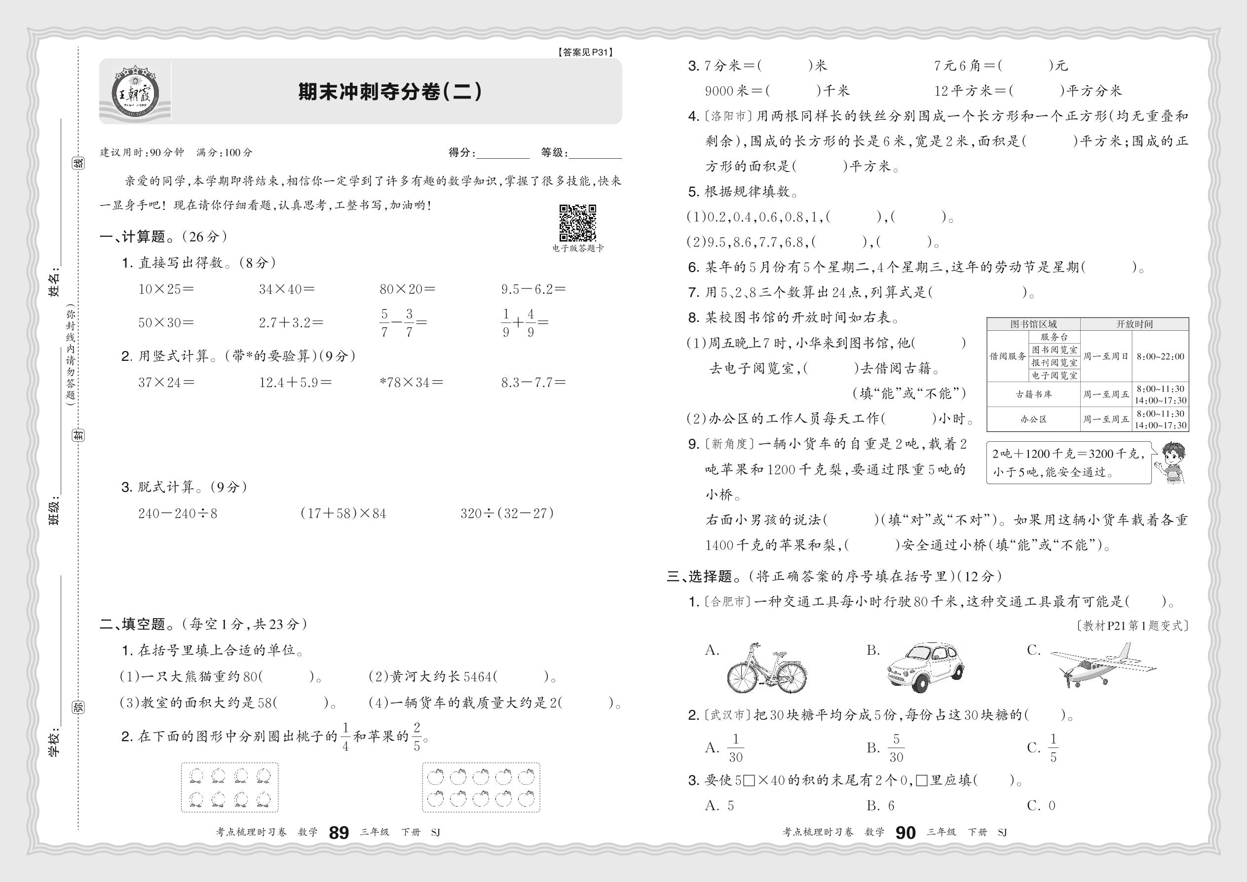 2024春下册三年级数学苏教版 期末冲刺夺分卷(二)