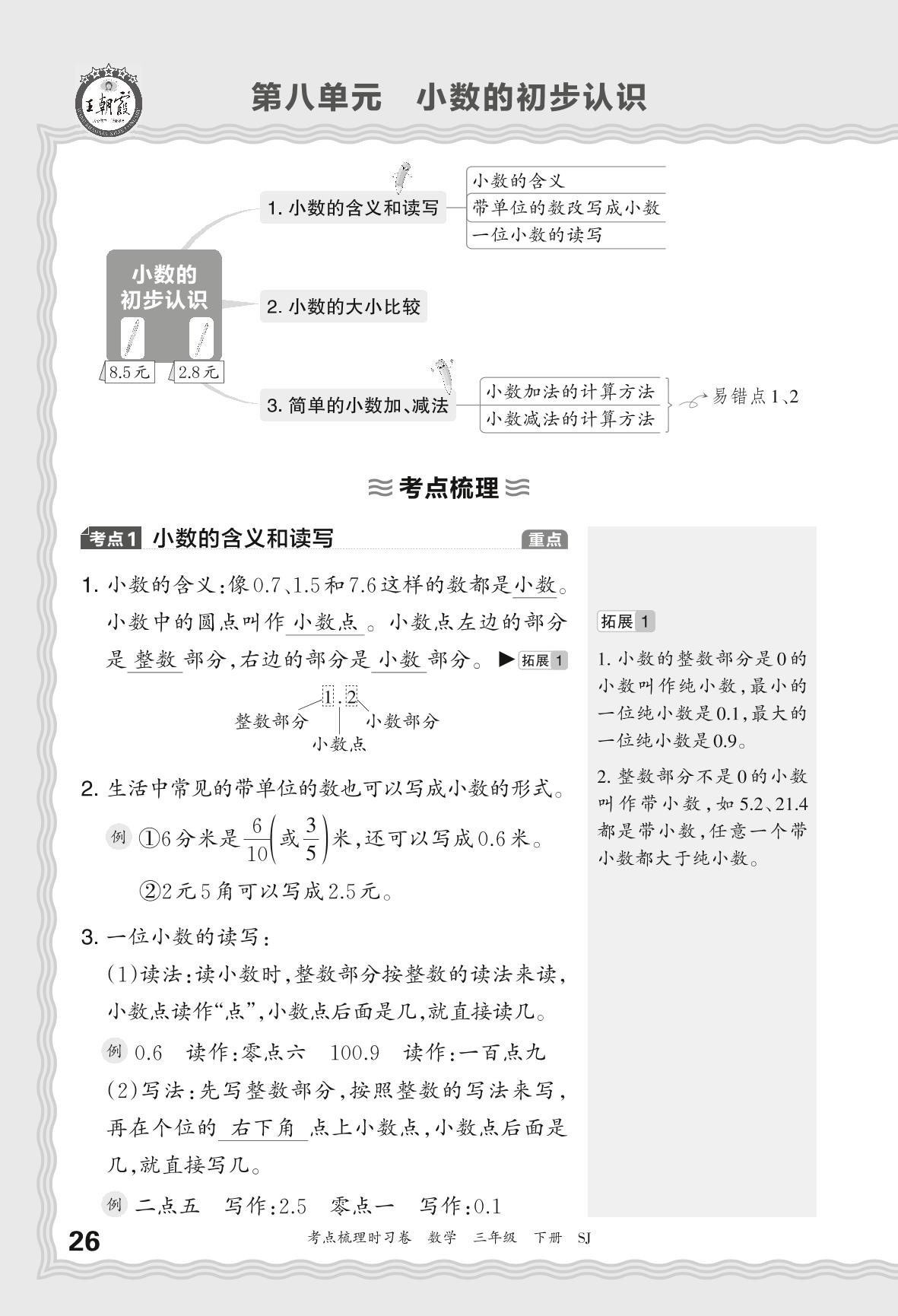 2024春下册三年级数学苏教版 考点梳理手册——第八单元 小数的初步认识