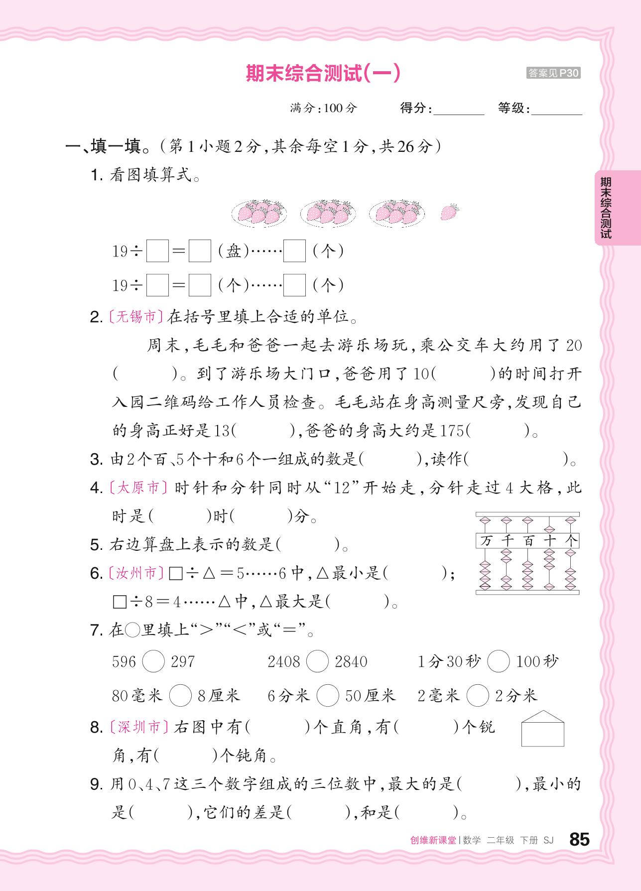 2024春下册二年级数学苏教版 期末综合测试(一)