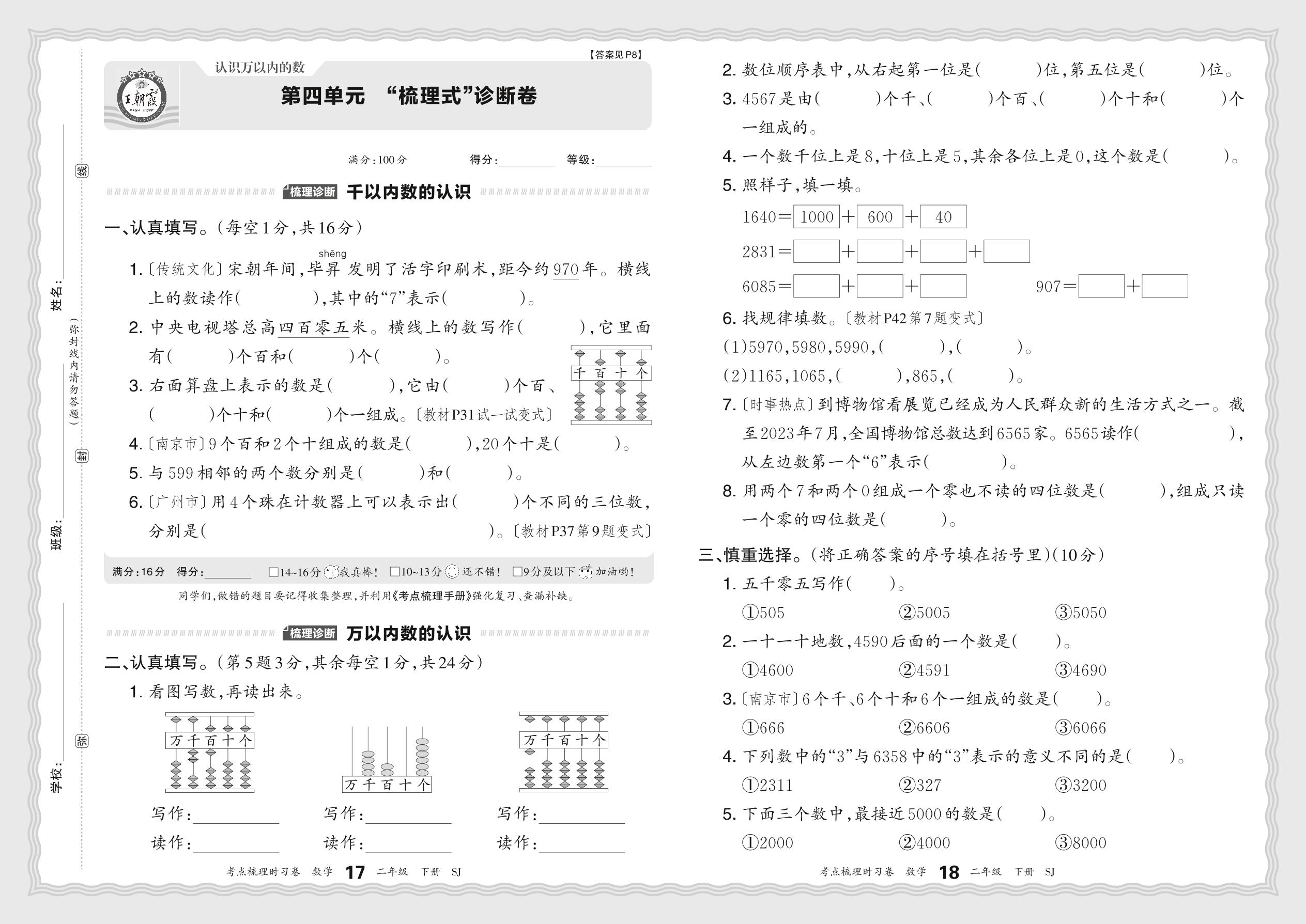 2024春下册二年级数学苏教版 第四单元 “梳理式”诊断卷