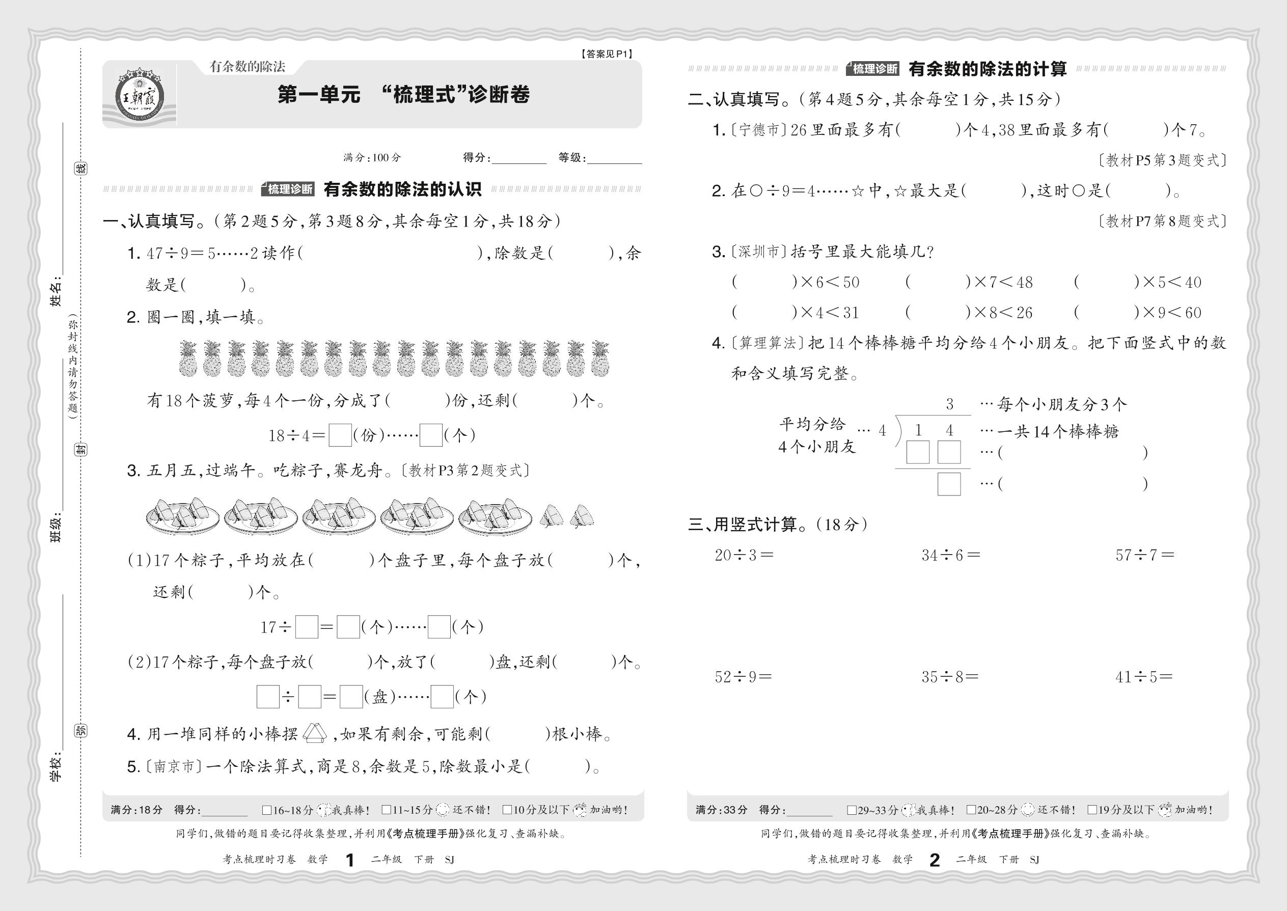 2024春下册二年级数学苏教版 第一单元 “梳理式”诊断卷
