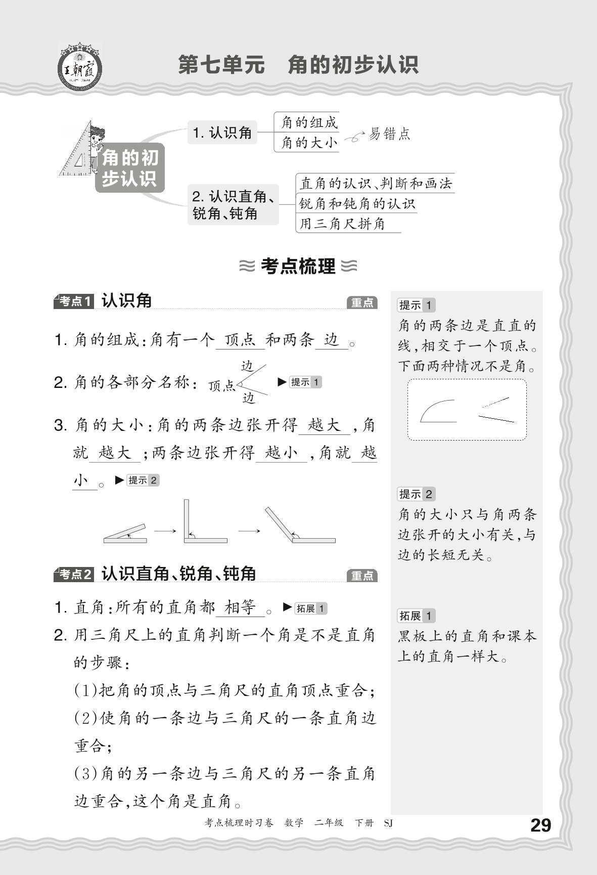 2024春下册二年级数学苏教版 考点梳理手册——第七单元 角的初步认识