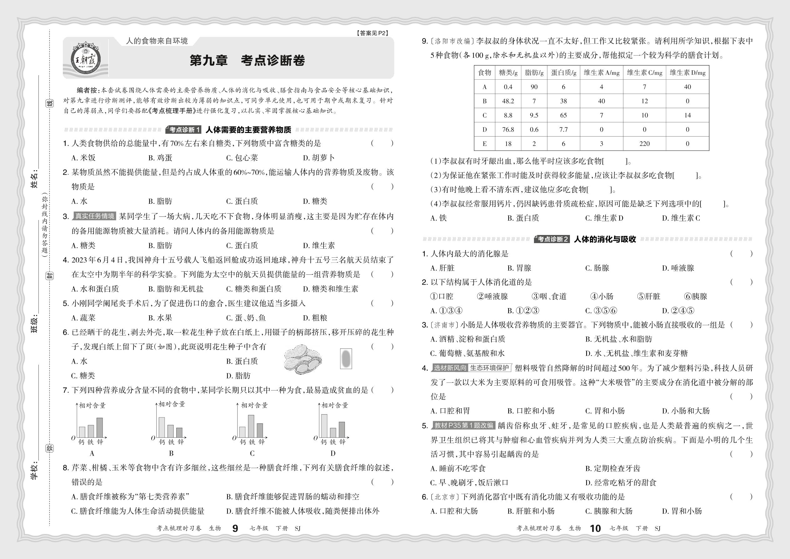 2024春下册七年级生物苏教版 第九章 考点诊断卷