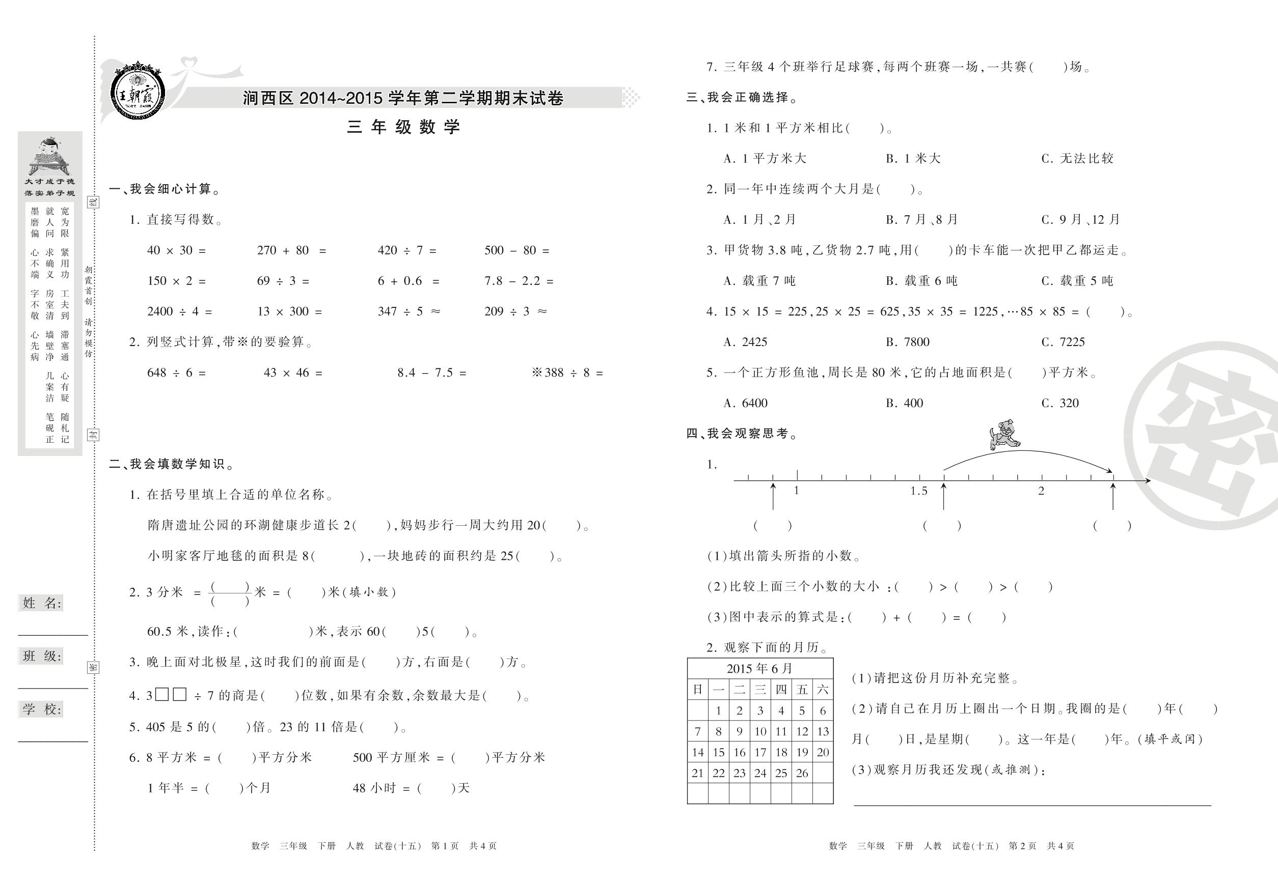 2015-2016学年第二学期洛阳市涧西区三年级数学试卷(人教版)【15】