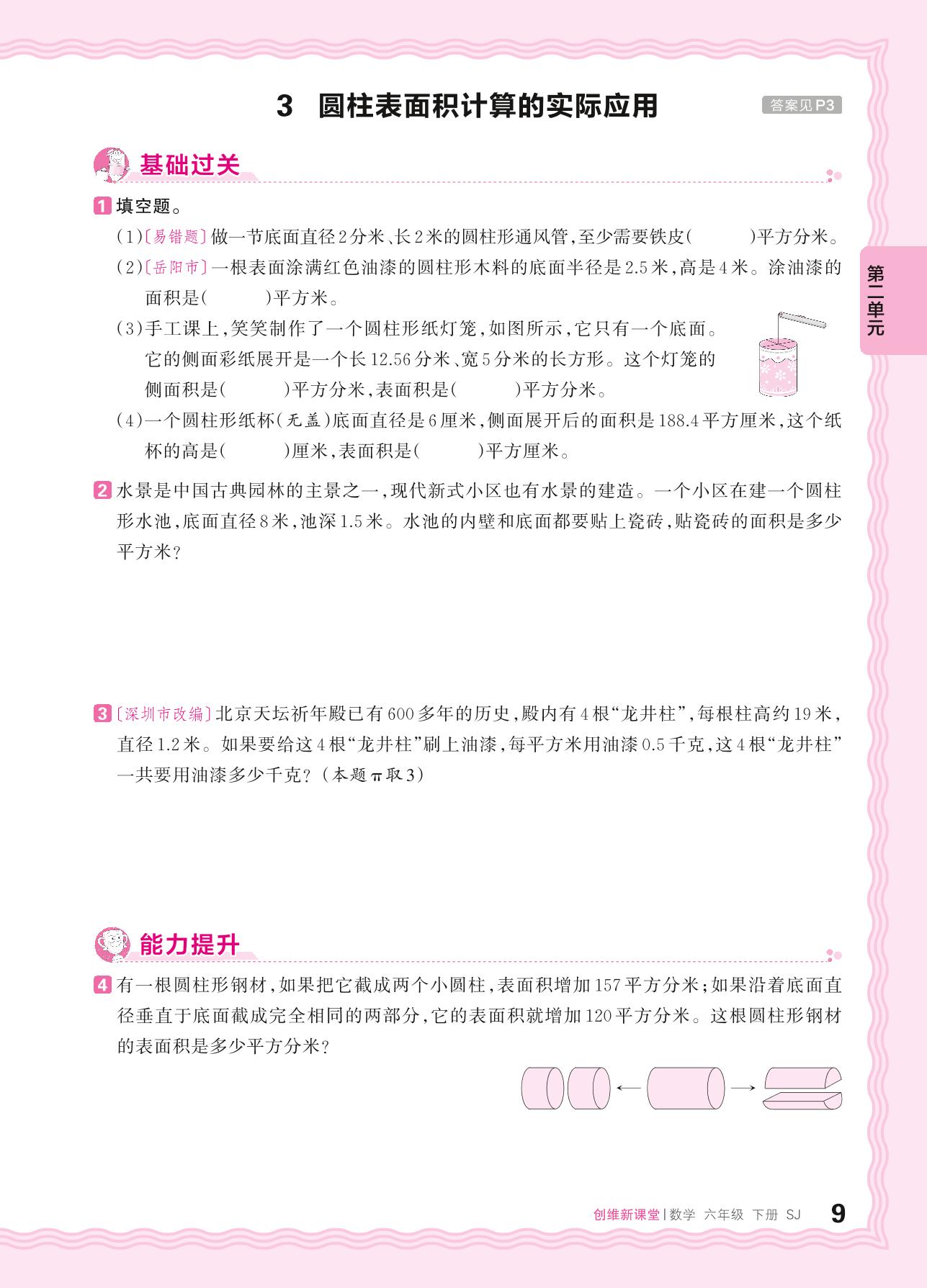 2024春下册六年级数学苏教版 第二单元 圆柱和圆锥——3. 圆柱表面积计算的实际应用